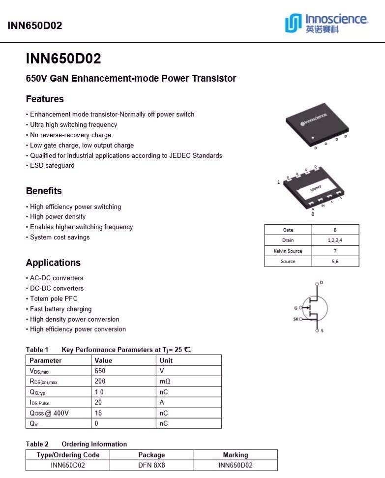 INN650D02 “InnoGaN”开关管高频特性好,且导通电阻小,适合高频高效的开关电源应用,采用DFN8*8封装,具备超低热阻,散热性能好,适合高功率密度的开关电源应用。