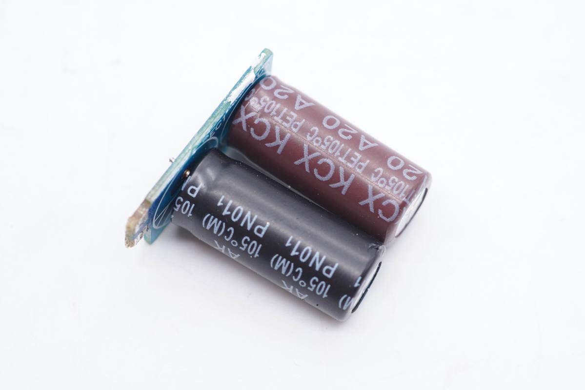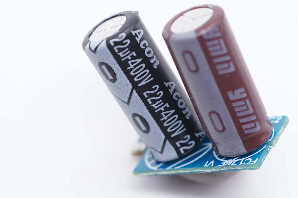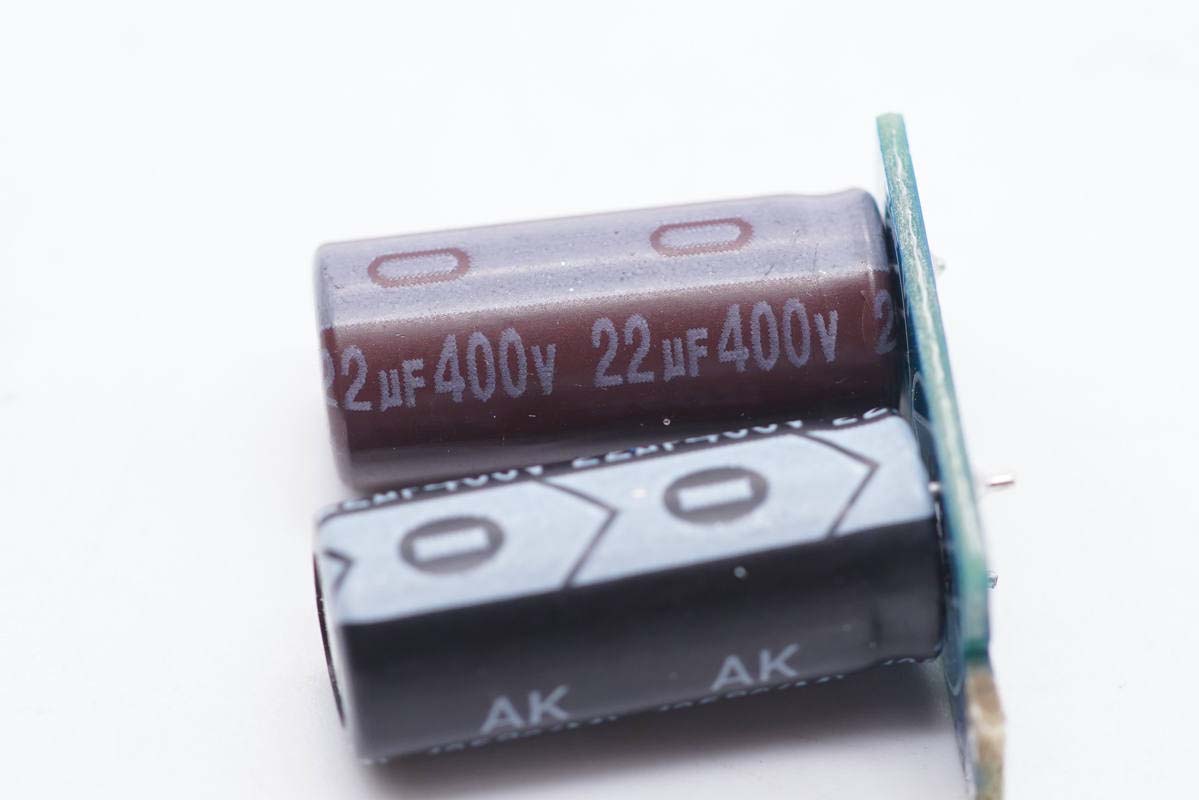 还有两颗焊接在小板上,一颗是Acon中元的,400V 22μF,另一颗来自永铭。
