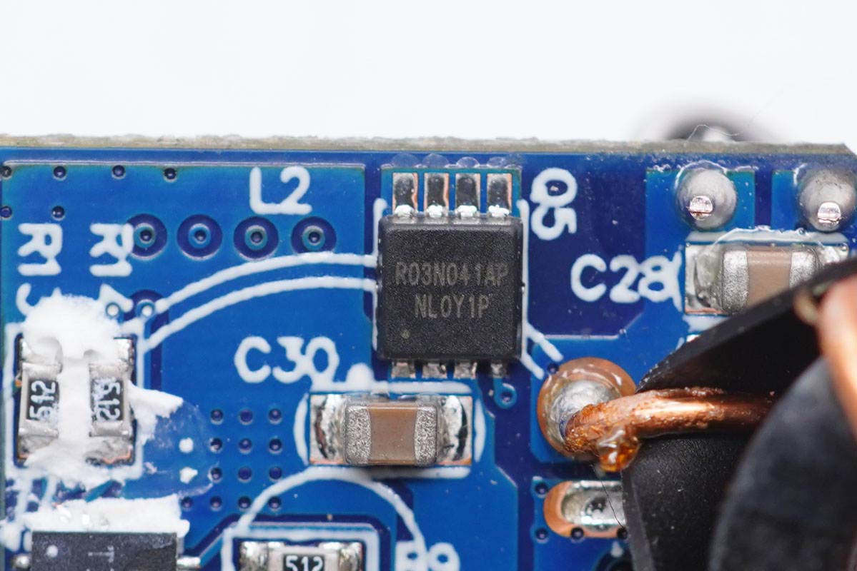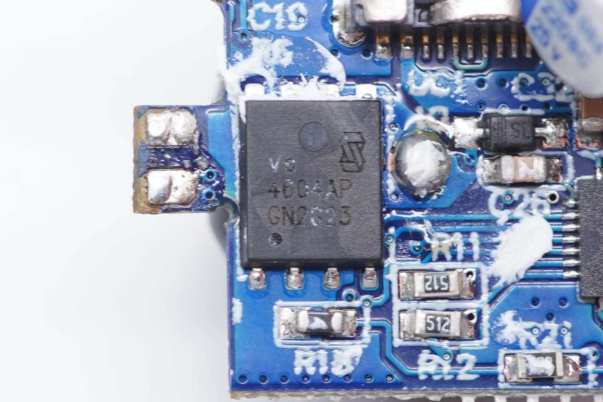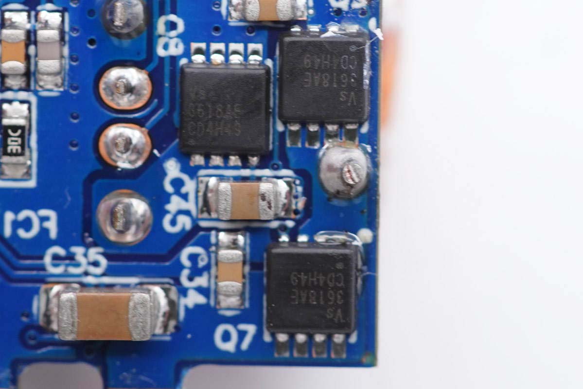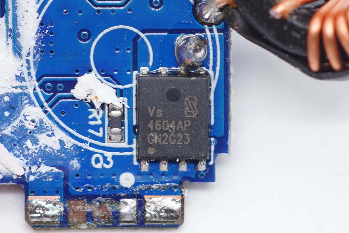 三颗MOS管均为威兆VS3618AE,耐压30V,PDFN3333封装。其中两颗用于为A口输出同步整流降压,一颗作为接口输出VBUS开关。