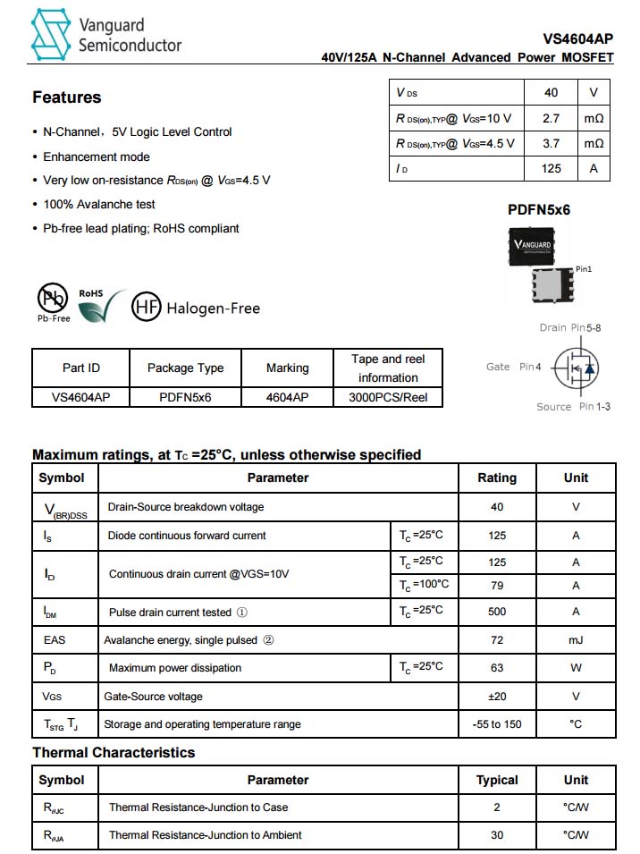 C1口同步整流降压输出MOS管采用威兆VS4604AP,NMOS管,耐压40V,PDFN5x6封装。