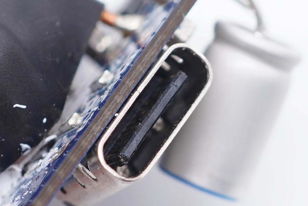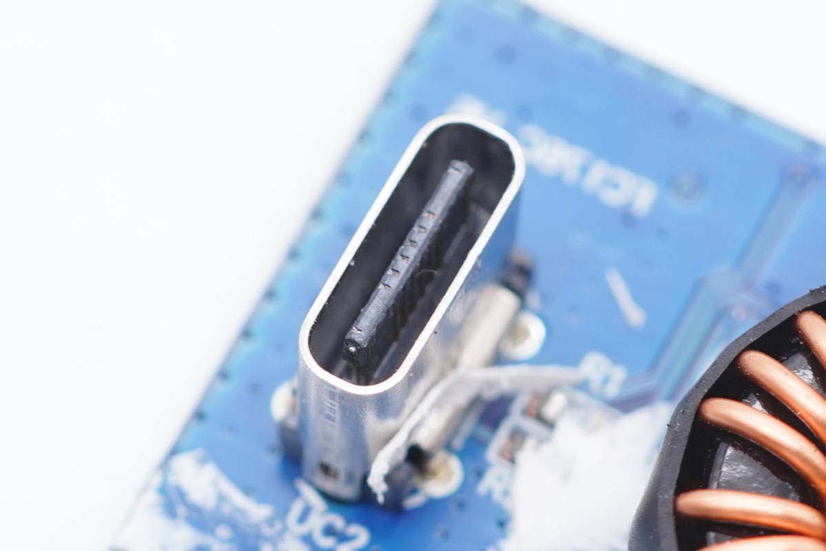 USB-C1母座特写,黑色胶芯不露铜,过孔焊接。