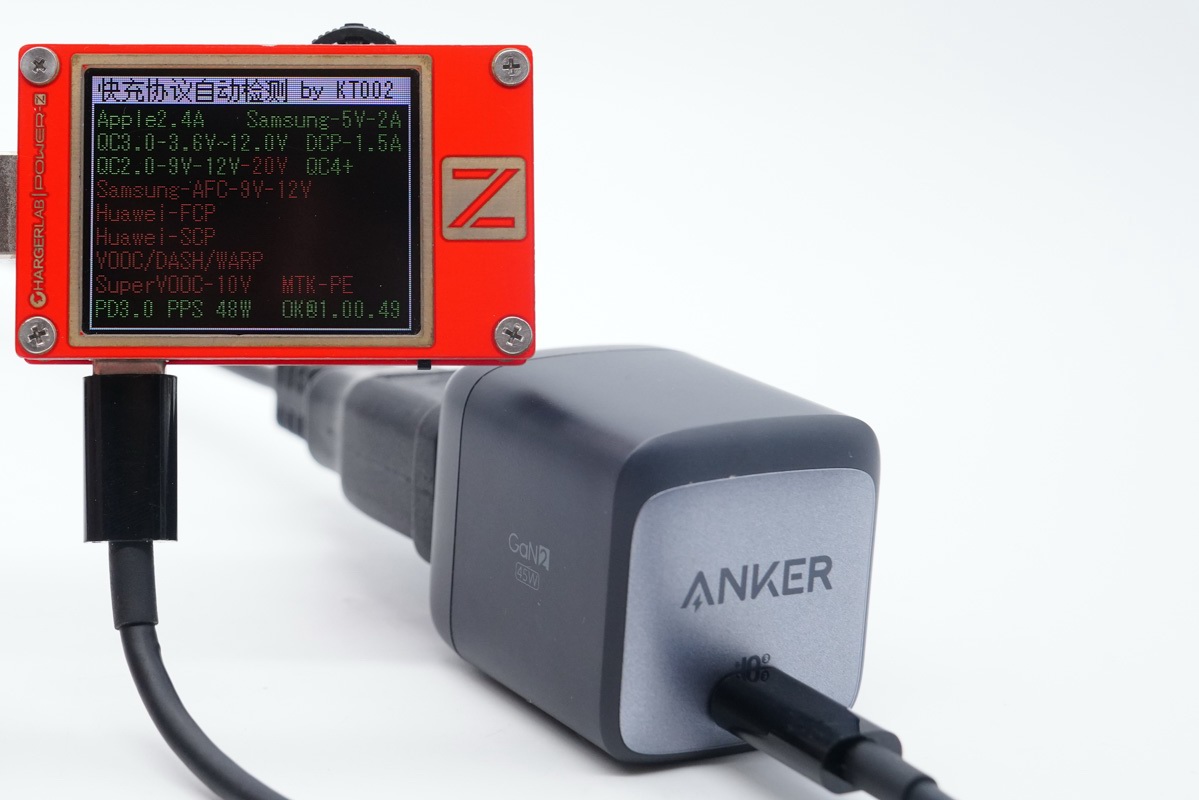 使用POWER-Z KT002 USB测试仪读取Anker氮化镓超能充45W充电器PDO报文,可以看到它基于PD3.0标准开发,带有5V3A / 9V3A / 15V3A / 20V2.25A四个固定电压档,另外还带有3.3-16V3A / 3.3-21V2.25A两组PPS电压子集,对笔记本、PPS设备提供更佳的充电匹配度。
