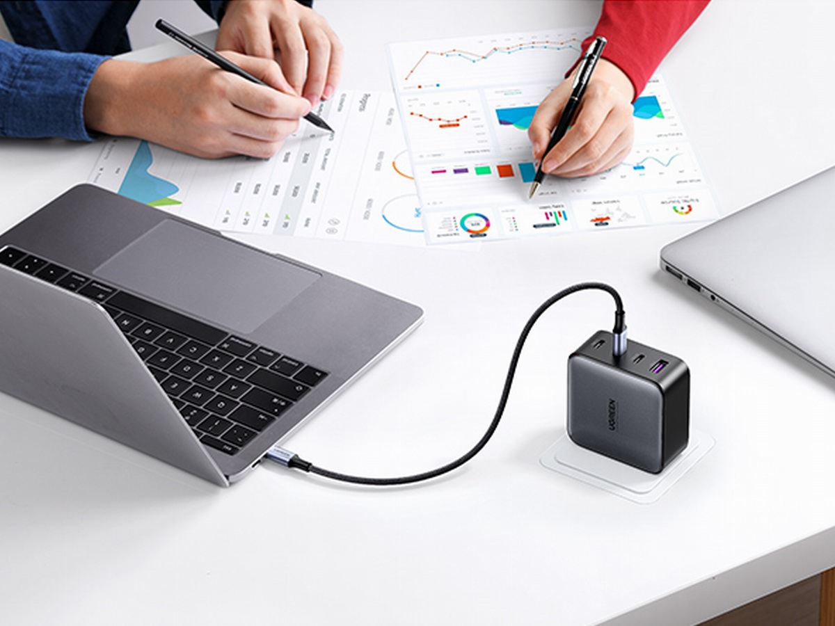 对商务用户而言,多人同时使用笔记本的场合十分普遍,面对长达数小时的会议保障双方笔记本电量变得尤为重要。绿联 100W 3C1A 氮化镓充电器支持为两台笔记本同时提供高速充电,通过智能功率分配调整为 65W + 30W 双口高压输出,让笔记本多人会议得到续航保证。