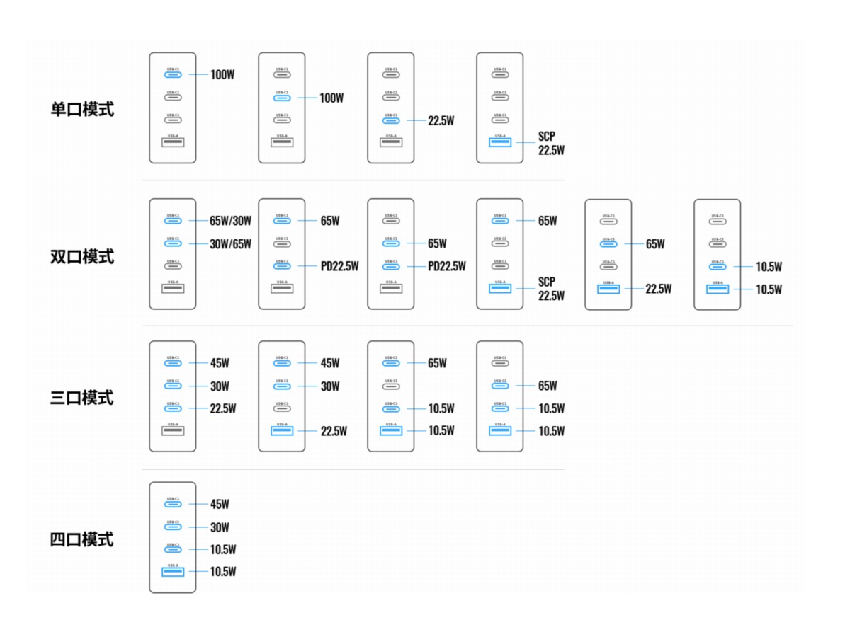 作为多口充电器,绿联 100W 3C1A 氮化镓充电器支持功率智能分配策略,可根据设备的充电状况调整为 100W、65W + 30W、65W + 22.5W、45W + 30W + 22.5W、45W + 30W + 10.5W + 10.5W等不同输出配置,为多设备提供稳定的电力供应。