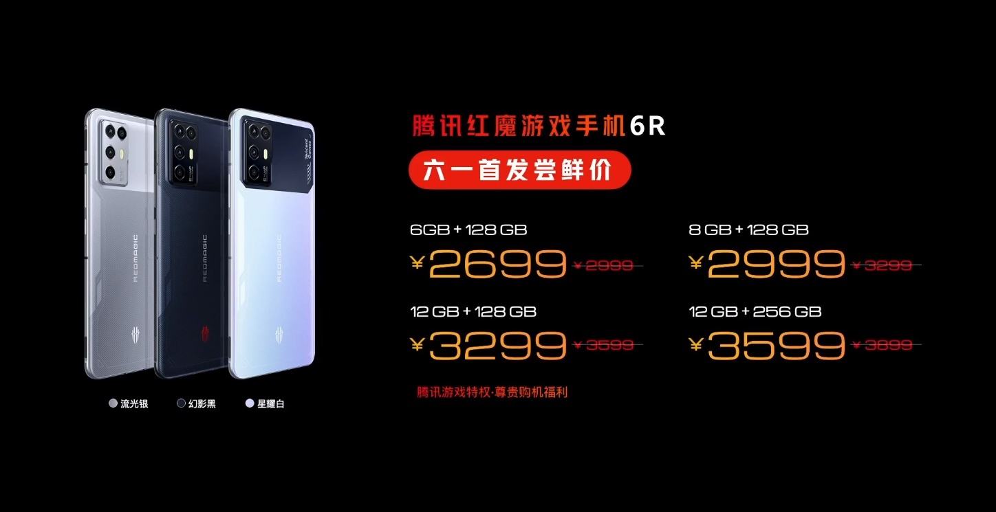 腾讯红魔游戏手机6R采用西装暴徒外观ID设计语言,共有幻影黑、星耀白、流光银,三色可选,6.67英寸144Hz超清电竞屏,骁龙888 + UFS3.1 + LPDDR5,触控式肩键,VC立体液冷散热系统,4200mAh容量电池55W快充,下面是四款容量售价公布。