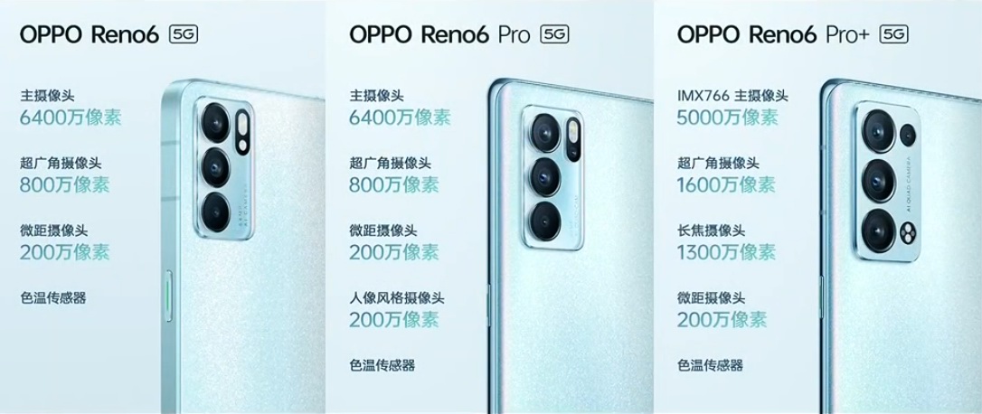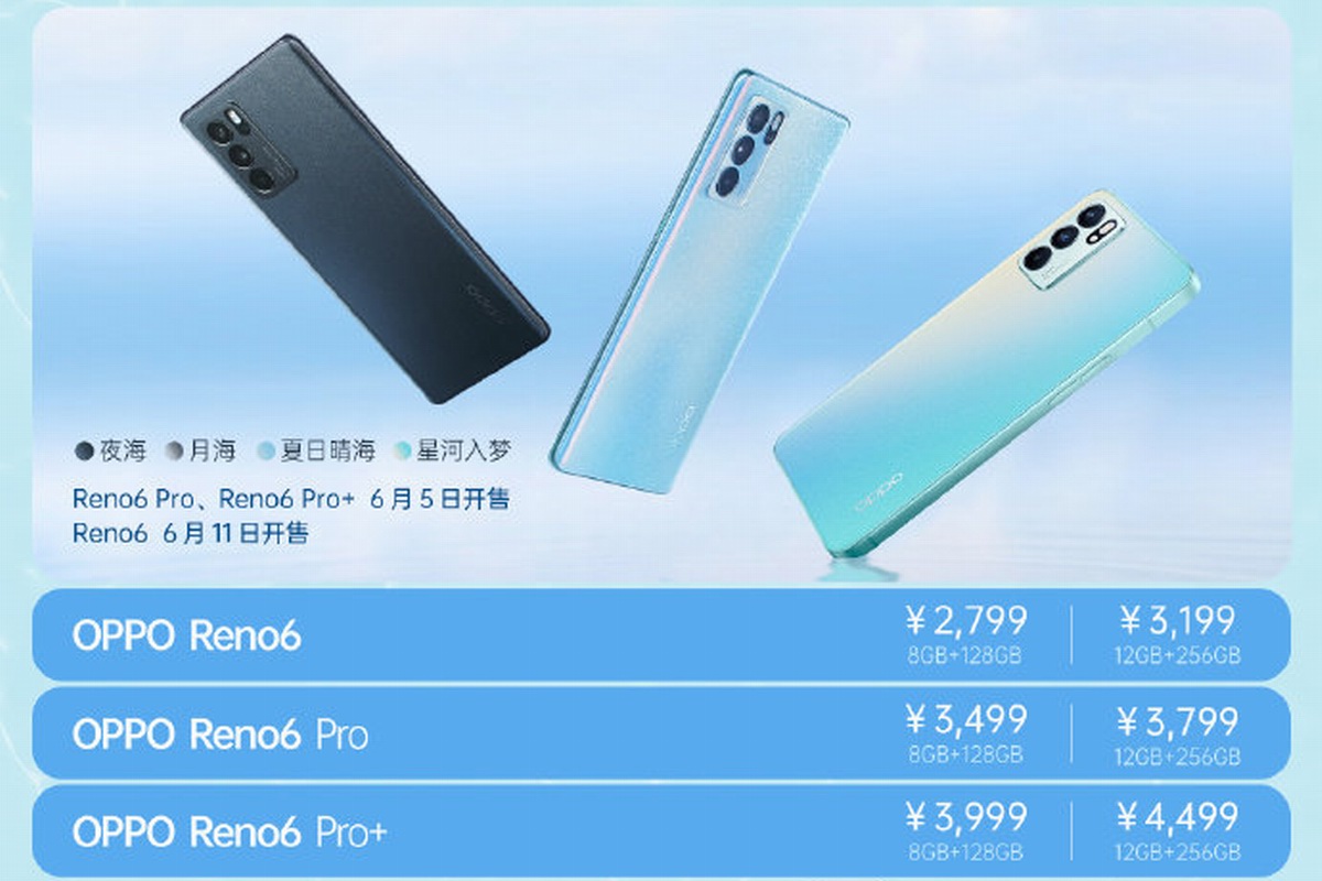 Reno 6采用6.43英寸AMOLED 90Hz高刷直屏,天玑900处理器,后置6400万像素三摄像头系统,4300mAh电池。Reno 6 Pro采用6.55英寸AMOLED 90Hz高刷曲面屏,天玑1200处理器,后置6400万像素四摄像头系统,4500mAh电池。Reno 6 Pro+采用6.55英寸AMOLED 90Hz高刷曲面屏,高通870处理器,后置索尼6400万像素四摄像头系统,4500mAh电池。全系列标配65W超级闪充,标配充电器数据线,下面是价格公布。