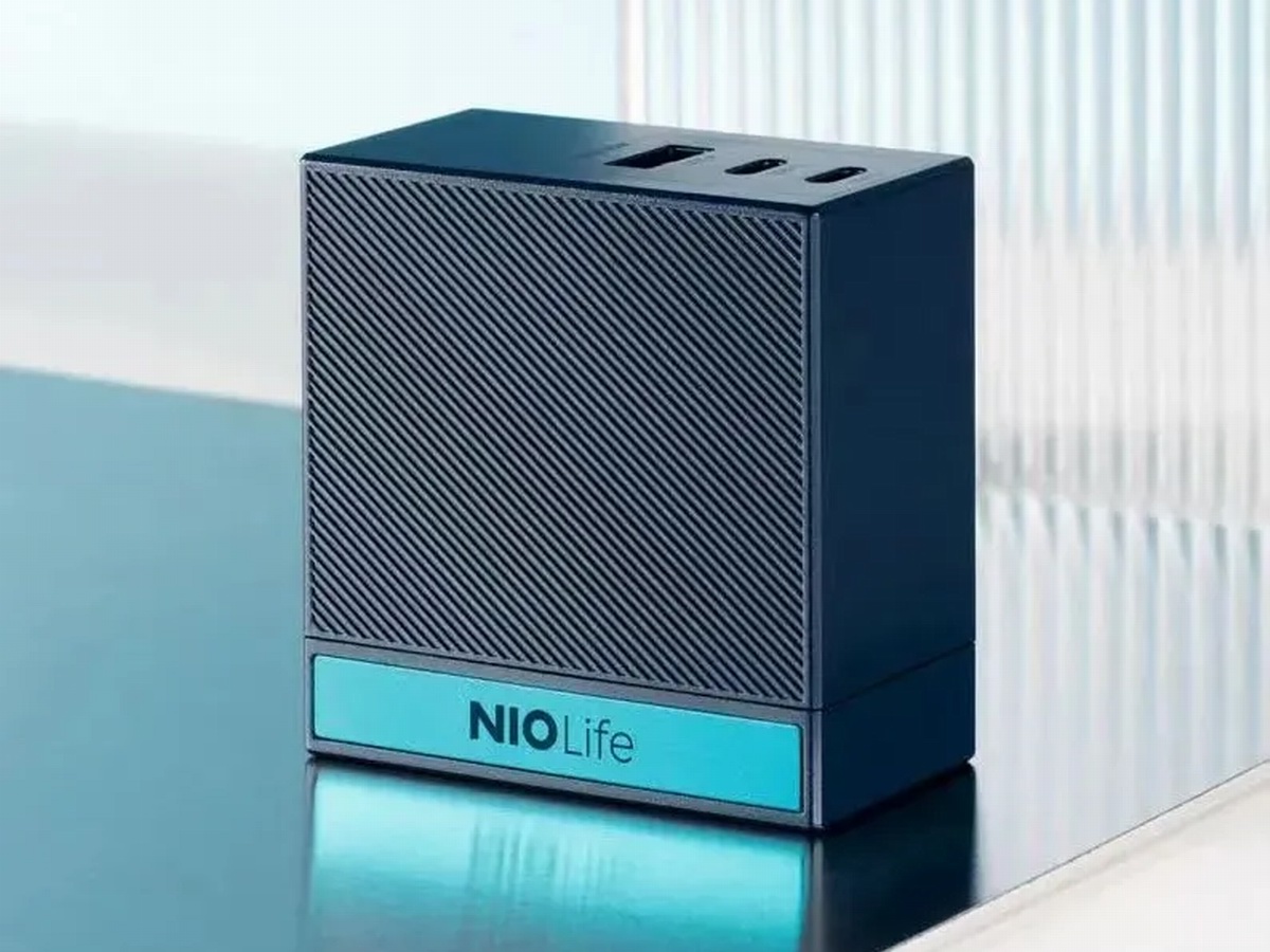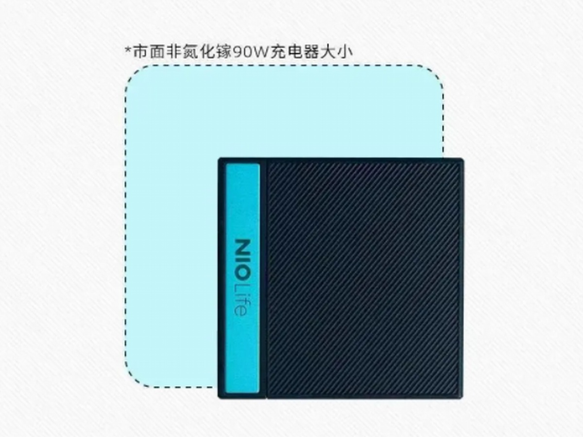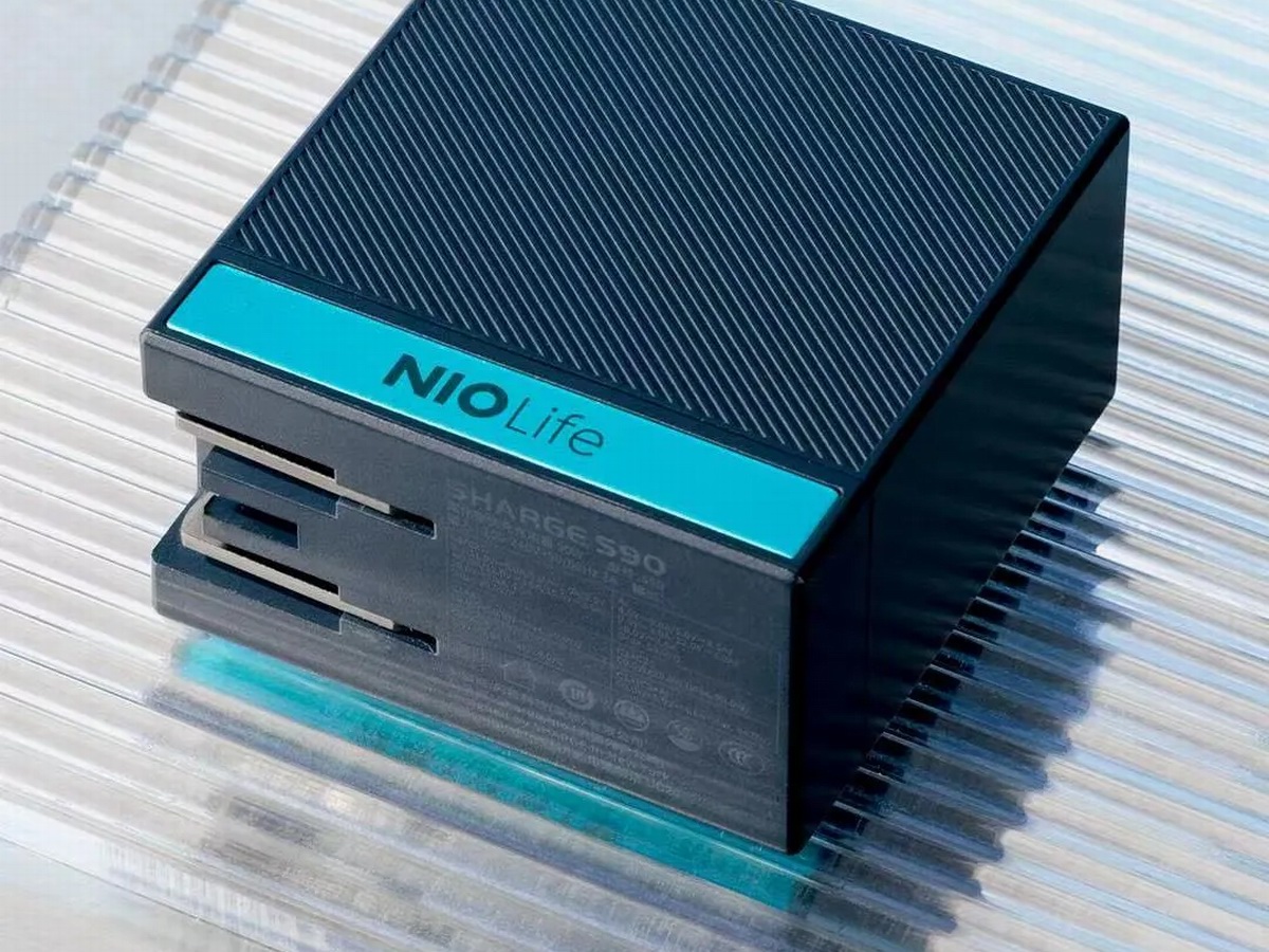 细看充电器壳体侧面,采用独特的斜纹槽工艺,相比起常见的平整表面,斜纹槽有效增加了表面积热换效率更佳,并带来不一样的手感。底部镶嵌一条“蔚来蓝”品牌色的标贴,印有NIO Life联名标志。