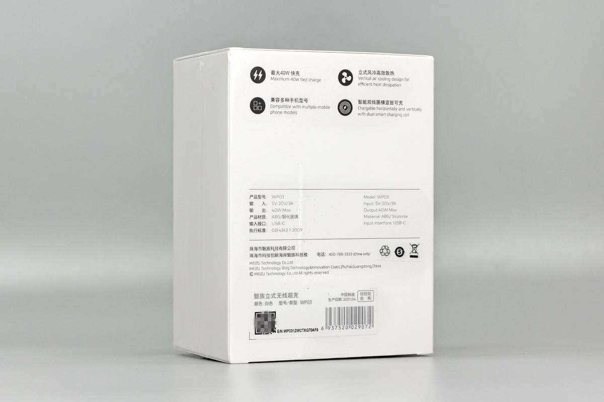 包装盒为白色,设计也比较简洁,正面印有MEIZU品牌、无线充外观和名称。