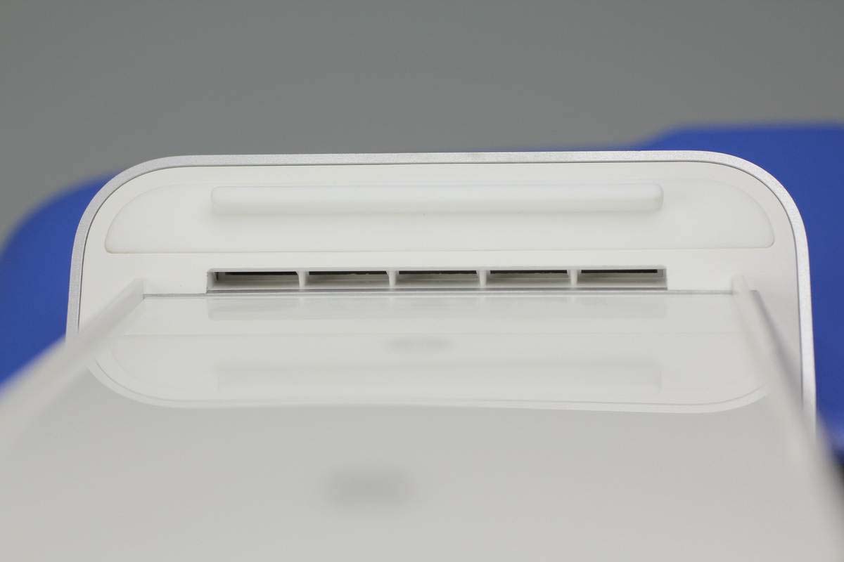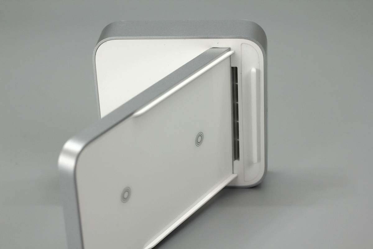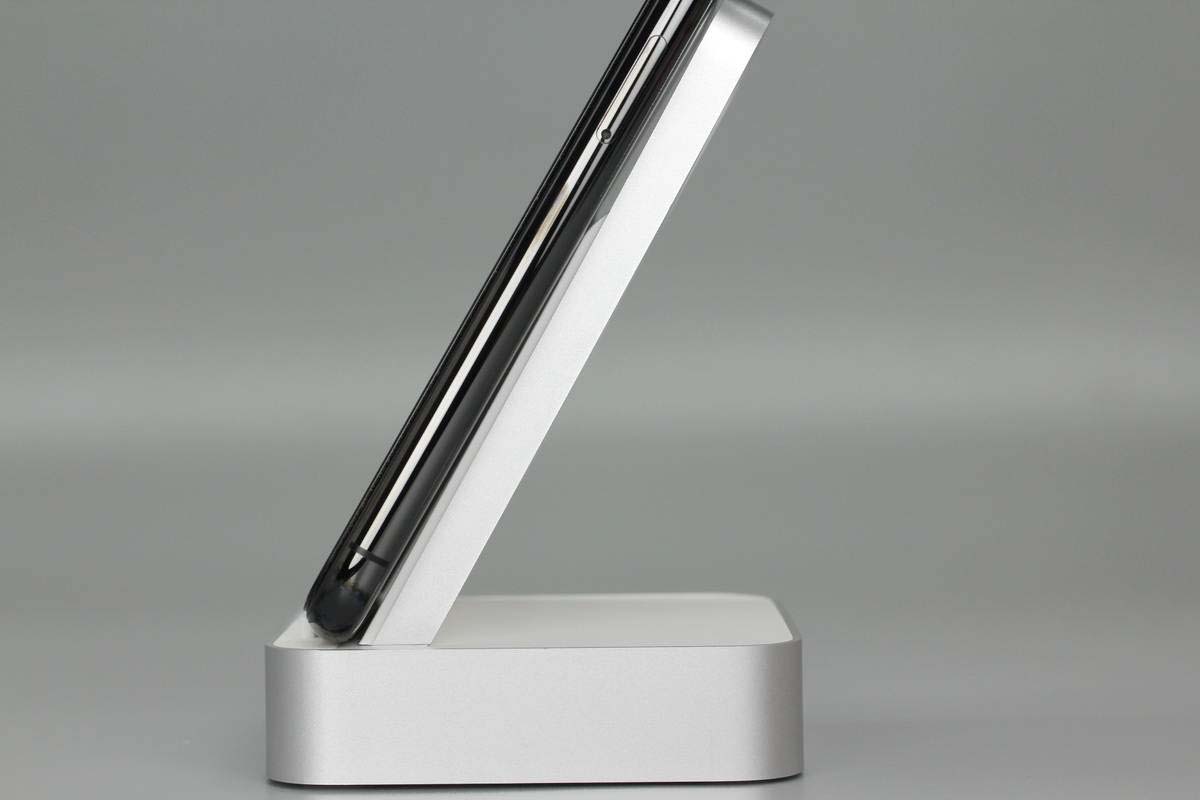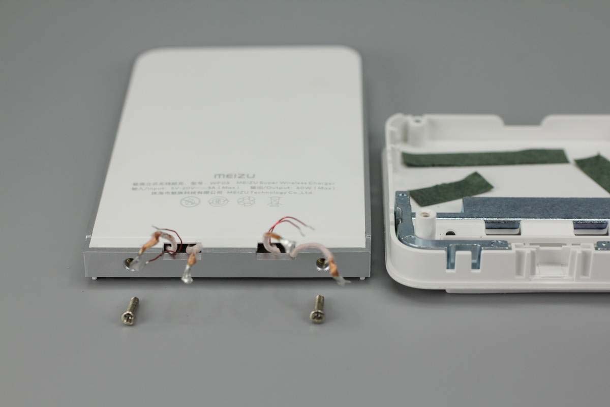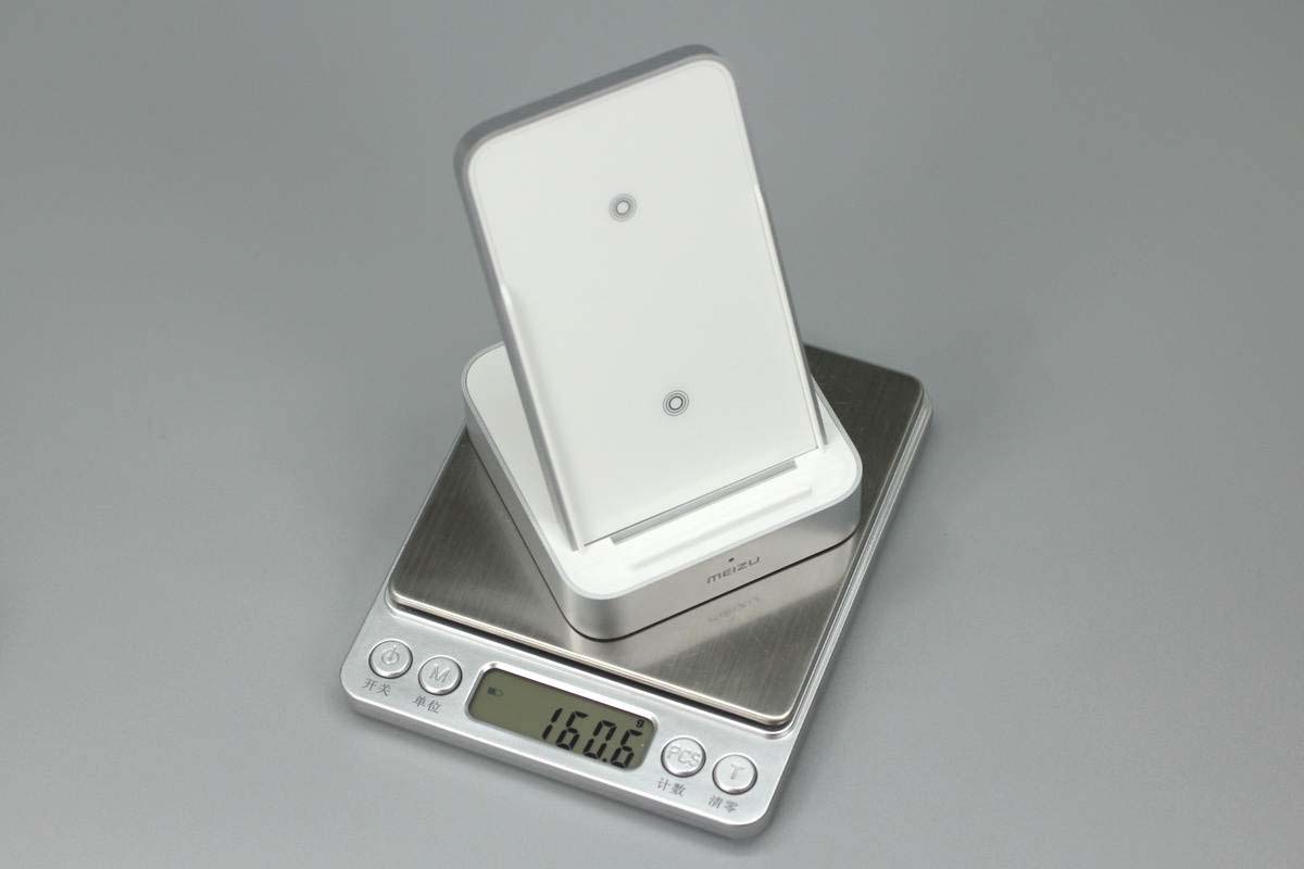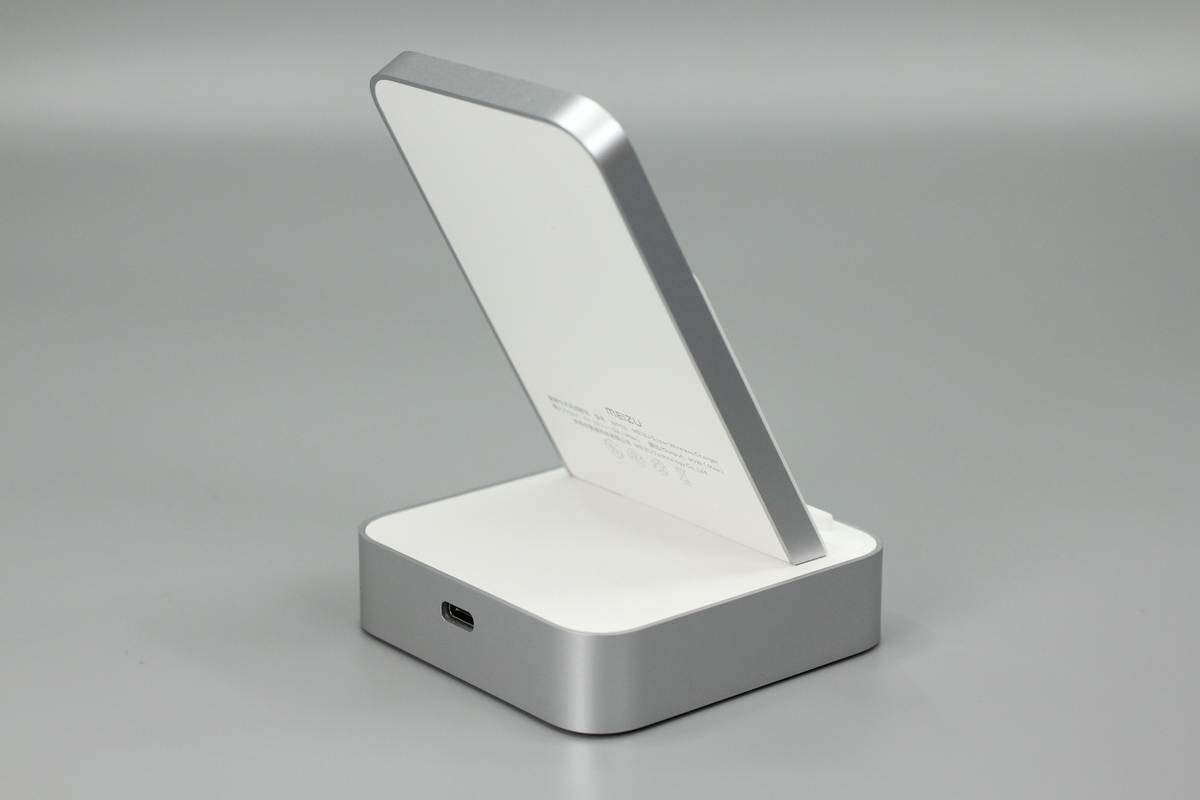 魅族这款无线充由底座和手机支撑板两部分组成,支撑板正面是ABS材质钢化玻璃,十分光滑,支撑板和底座侧身均喷砂银灰色涂料进行装饰。