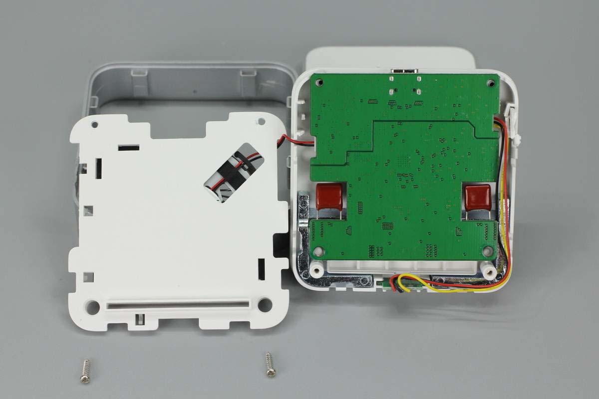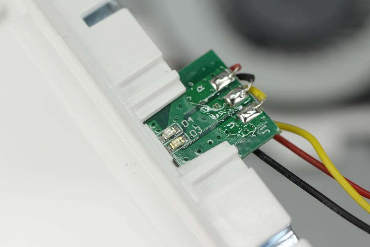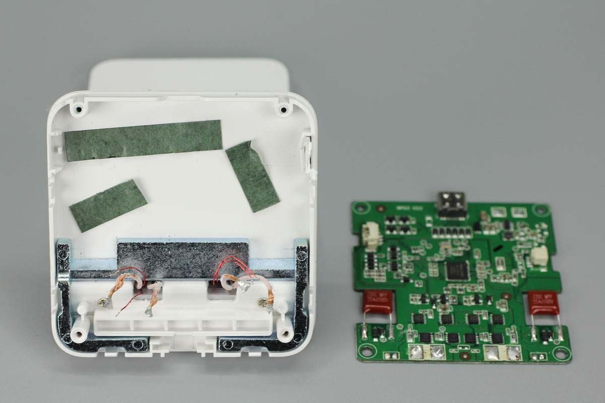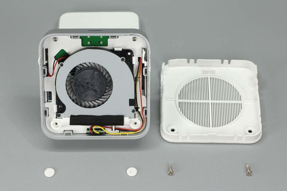 拆掉两颗螺丝即可将底部外壳打开,风扇使用卡扣进行固定,并且风扇和PCB板间有一块白色塑料板进行隔离。