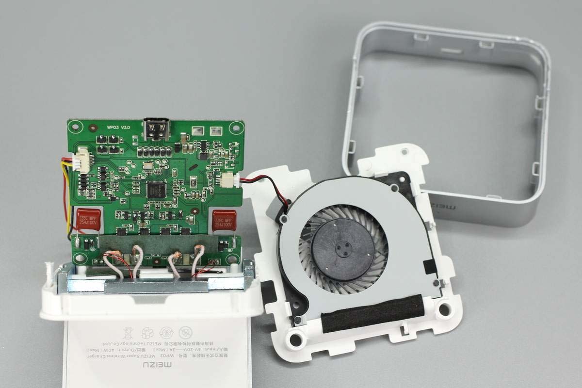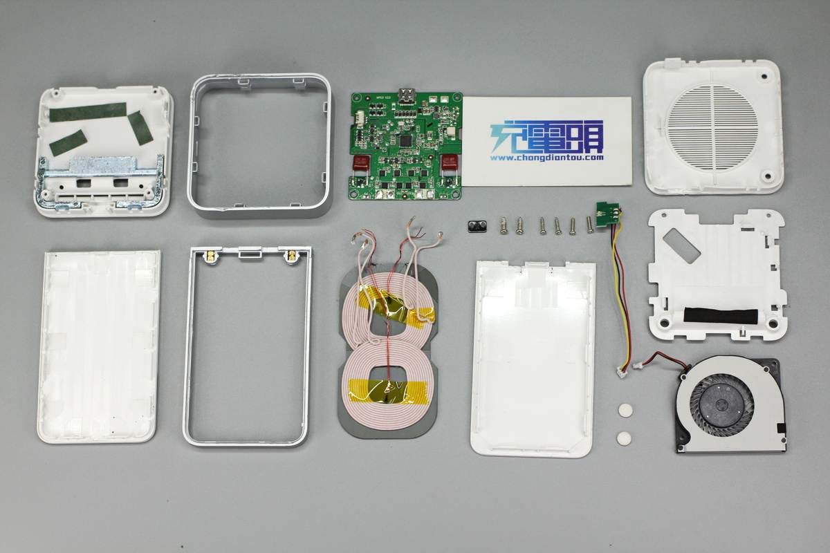 充电头网通过拆解了解到,整个无线充内外主要都是采用螺丝进行封装固定,部分机身壳卡扣封装,因此可以做到无损拆解。小风扇和PCB板间有塑料板隔离,同时小风扇也是固定在隔离板上。采用矽力杰SY8201降压为无线充电主控和散热风扇供电,功率级供电直接由外部适配器提供,并由美芯晟MT5815主控芯片控制方舟MOS管进行线圈驱动输出,采用威兆MOS管实现双线圈自由切换。