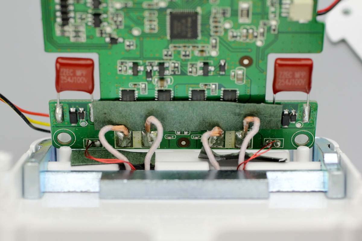 隔离塑料板以及PCB板也是使用两颗螺丝进行固定,PCB板背面没有设元器件,两侧的两颗电容处镂空处理。