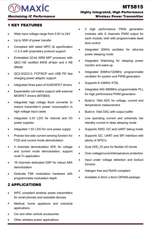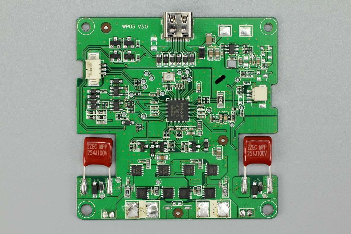 无线充电主控芯片采用美芯晟MT5815。这是一款带有USB-PD协议、高度集成的符合Qi标准的无线充电发射芯片,支持高达50W的输出功率,向下兼容不受限。MT5815集成ARM M0 处理器,拥有卓越的高效率和紧凑设计,适用于各种低成本、低功耗应用,可广泛应用于为5G智能终端、智能可穿戴设备、智能家居、物联网、智能家电进行无线充电的设备。充电头网此前已对该芯片做了相关报道。
