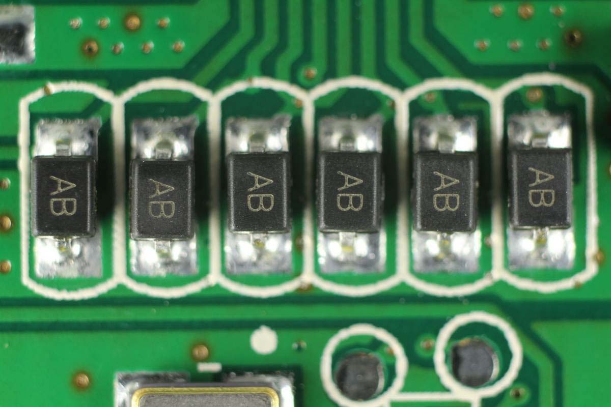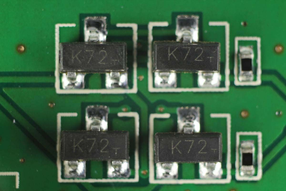 PCB板正面一览,中心设有一颗无线充电主控芯片,末端有8颗MOS管。