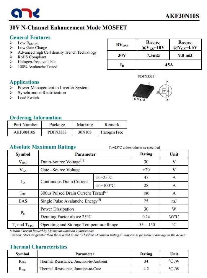 四颗方舟AKF30N10S增强型MOS管,NMOS,耐压30V,PDFN3333封装,用于无线充电线圈驱动。