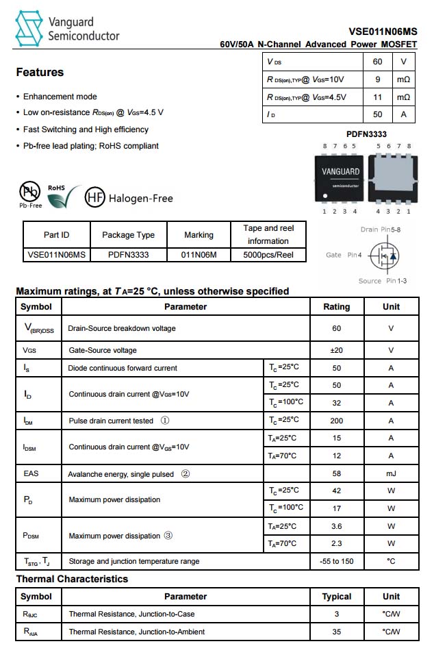 四颗威兆VSE011N06MS,NMOS管,耐压60V,用于无线充电线圈切换。