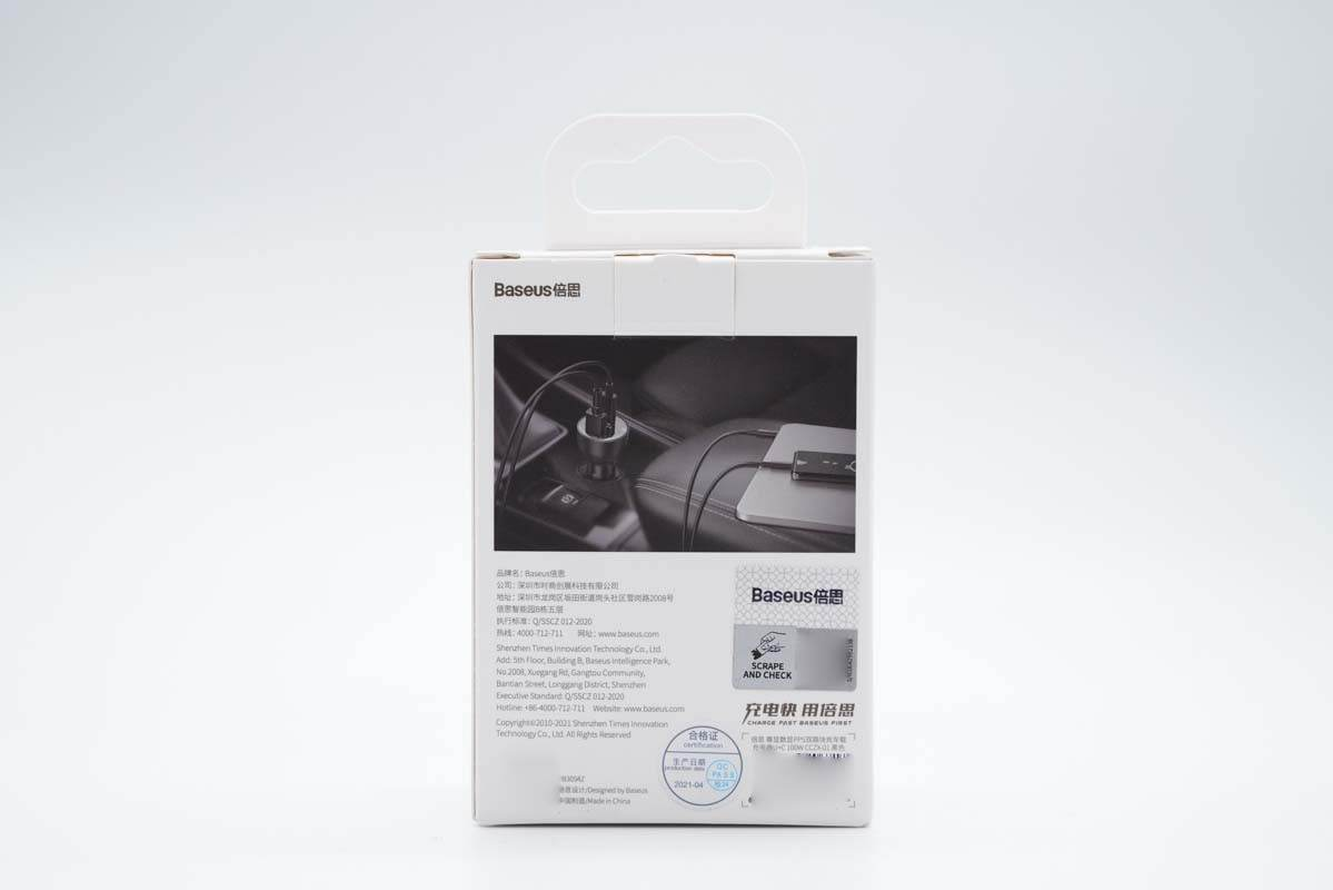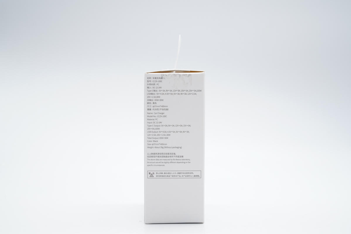 包装盒正面印有Baseus品牌、车充外观图、名称和100W快充标识。