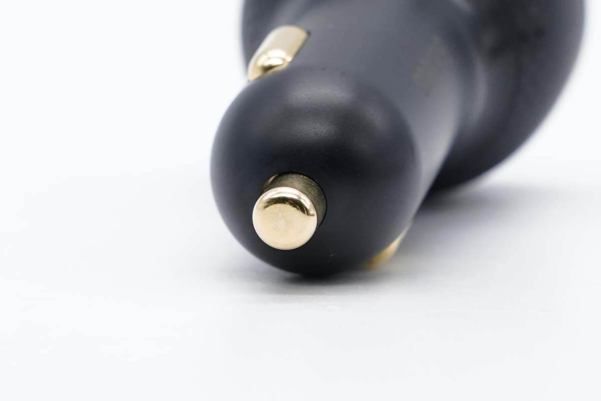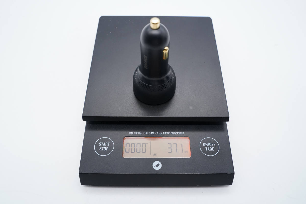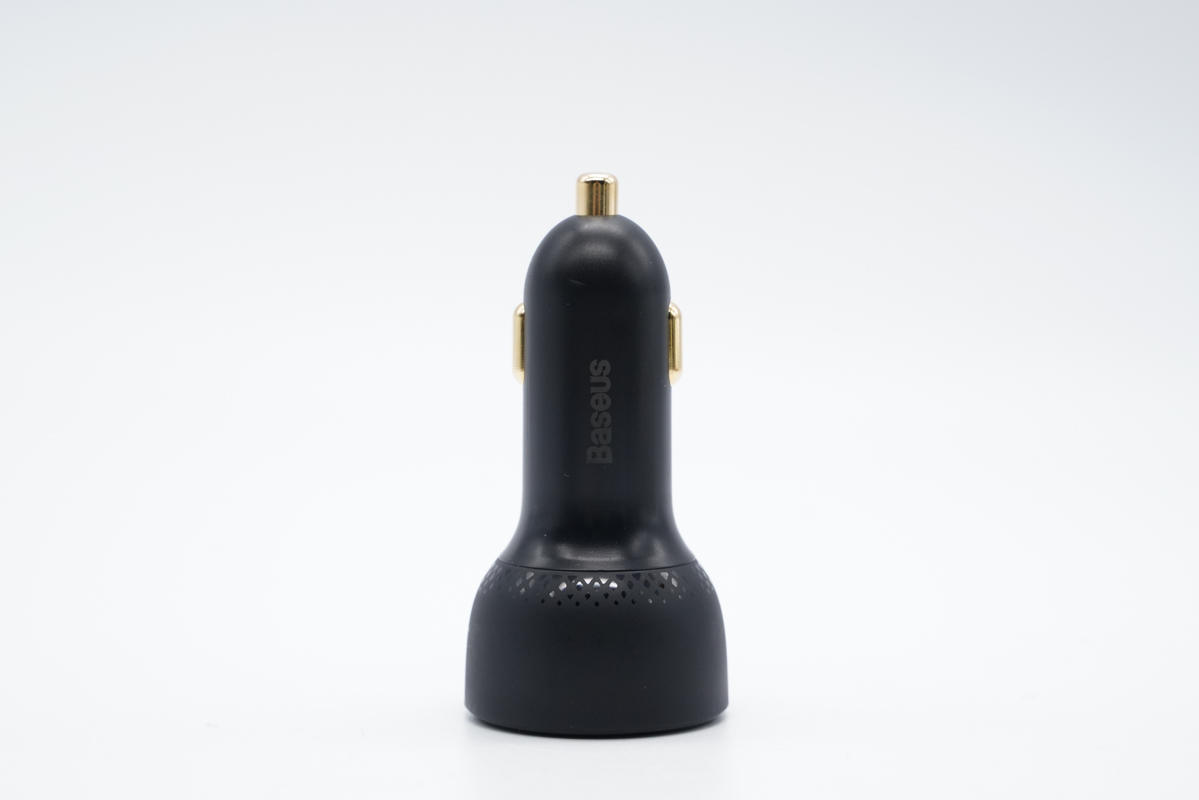 车充采用一体成型塑料壳,整体圆润,机身壳表面哑光处理,正面印有Baseus品牌。