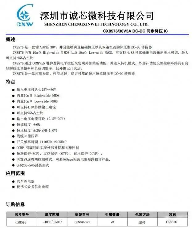 CX8576通过COMP/EN 引脚逻辑电平拉低来实现外部关断功能,并进入待机模式。外部补偿使反馈控制环路具有良好的线压调整率和负载调整率,且外围设计灵活,是一款应用极简,性能卓越,稳定可靠的恒压恒流降压型DC-DC转换器。