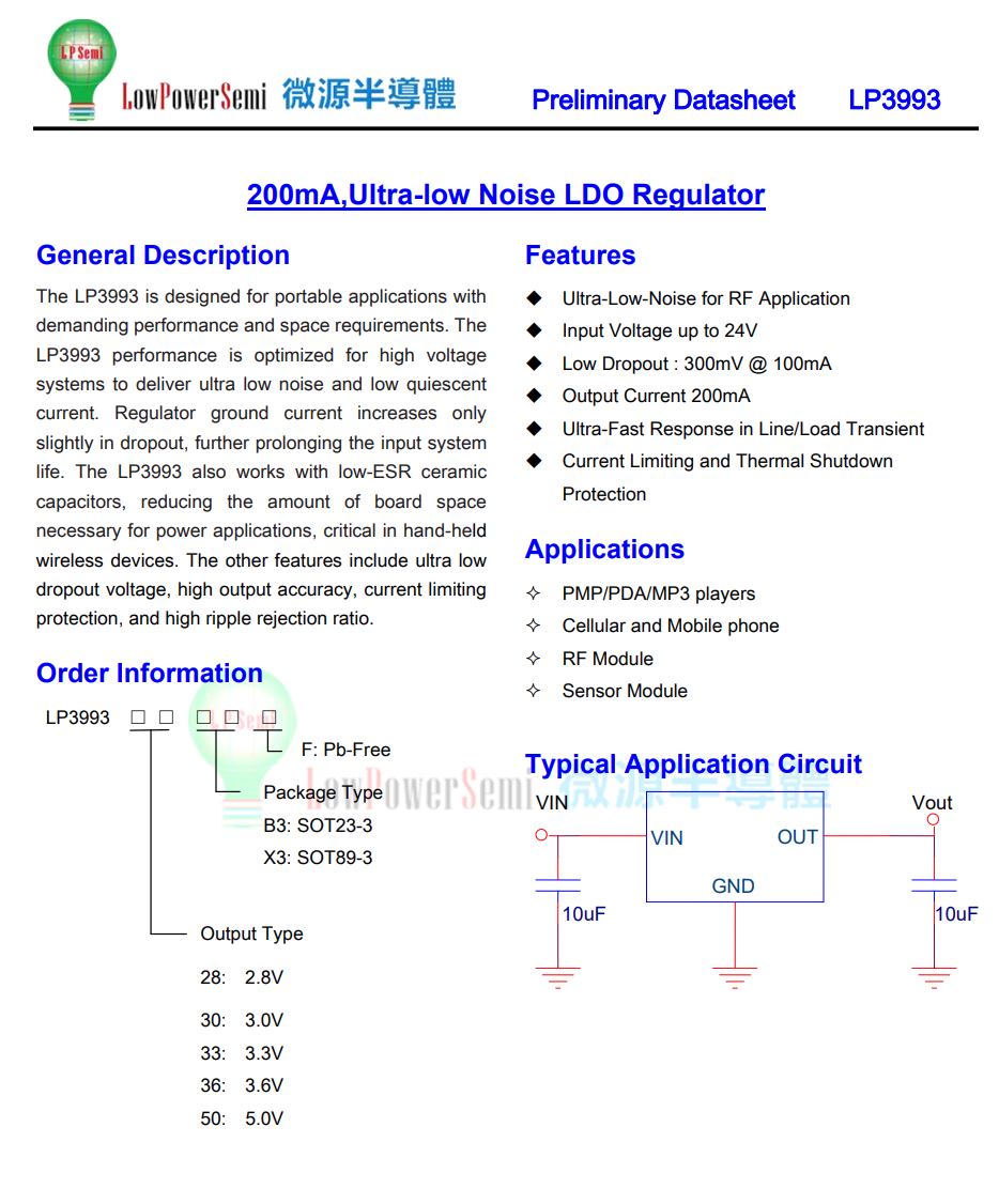 微源半导体 LPS3993 200mA超低噪声稳压器,输出电压3.3V为协议芯片供电。