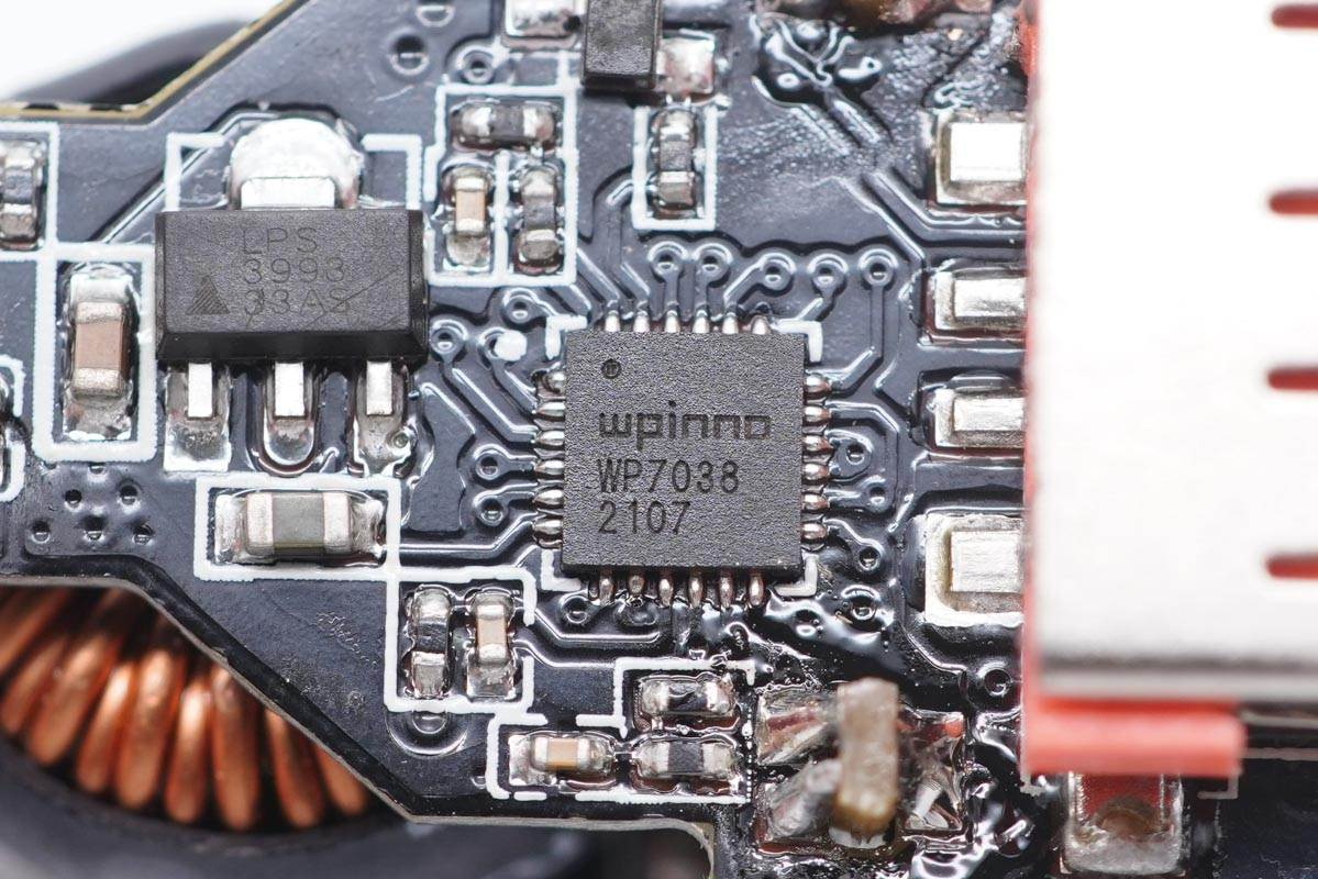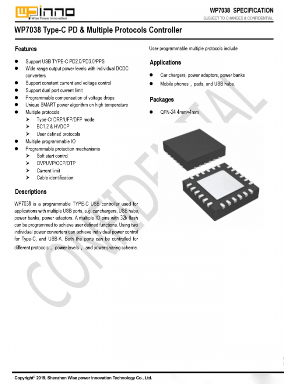 采用维普创新WP7038作为这款车充两个接口的协议芯片,控制接口输出电压。这是维普创新公司最新推出的Type-C系列IC,具备每个接口独立调节的全协议功能;具有输入电压范围广5-24V,输出电压范围广3.5-24V(自适应)和输出电流1-5A(根据协议自适应)的特点;同时内置高效MCU,内置独立全协议调节功能;此外芯片可实现双口独立输出,真正实现双口双快充。