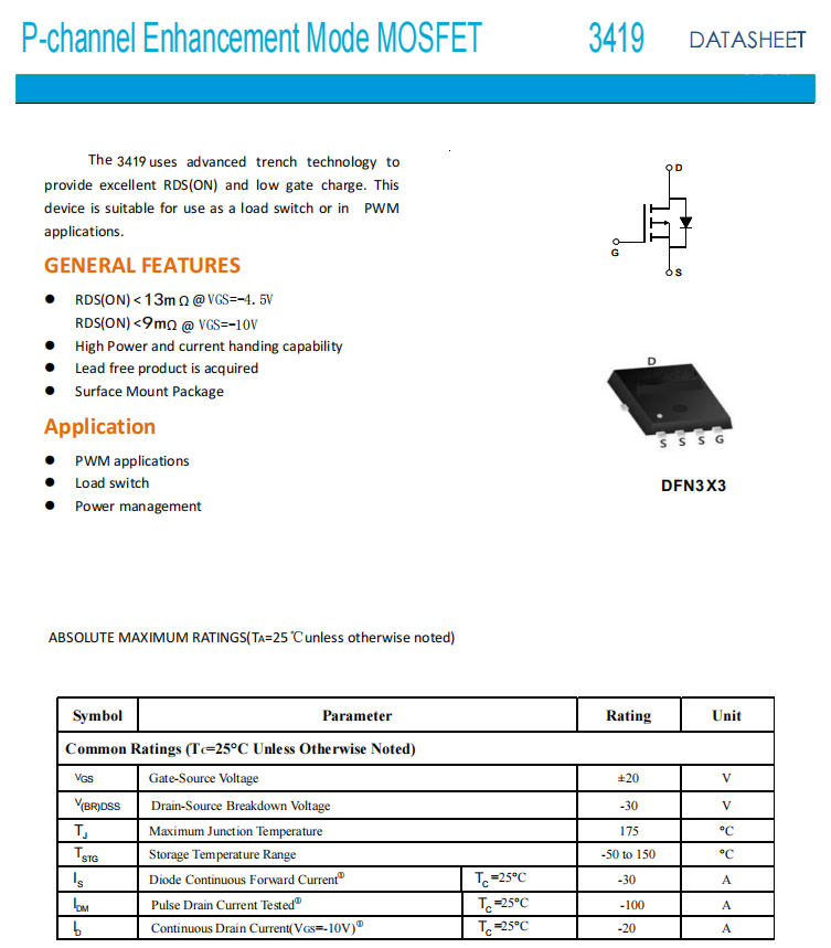 USB-A口输出VBUS开关特写,诚芯微3419,PMOS管,耐压30V,DFN3x3封装。