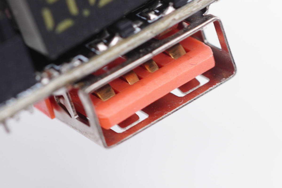 USB-A母座特写,正负极加宽,用于5A大电流快充。