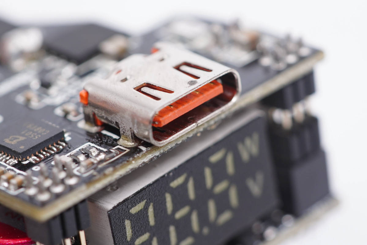 USB-C母座特写,过孔焊接。橙色胶芯不露铜,舌片内部夹钢片,经久耐用。
