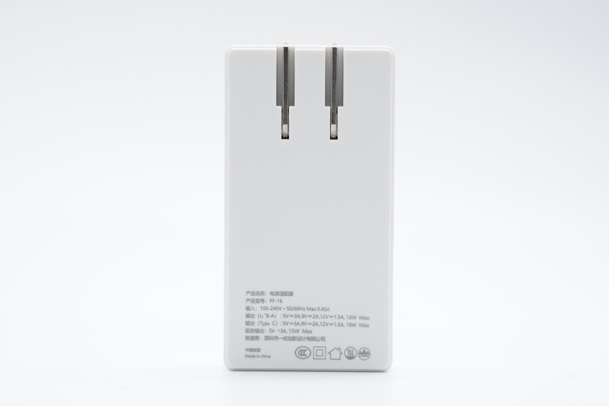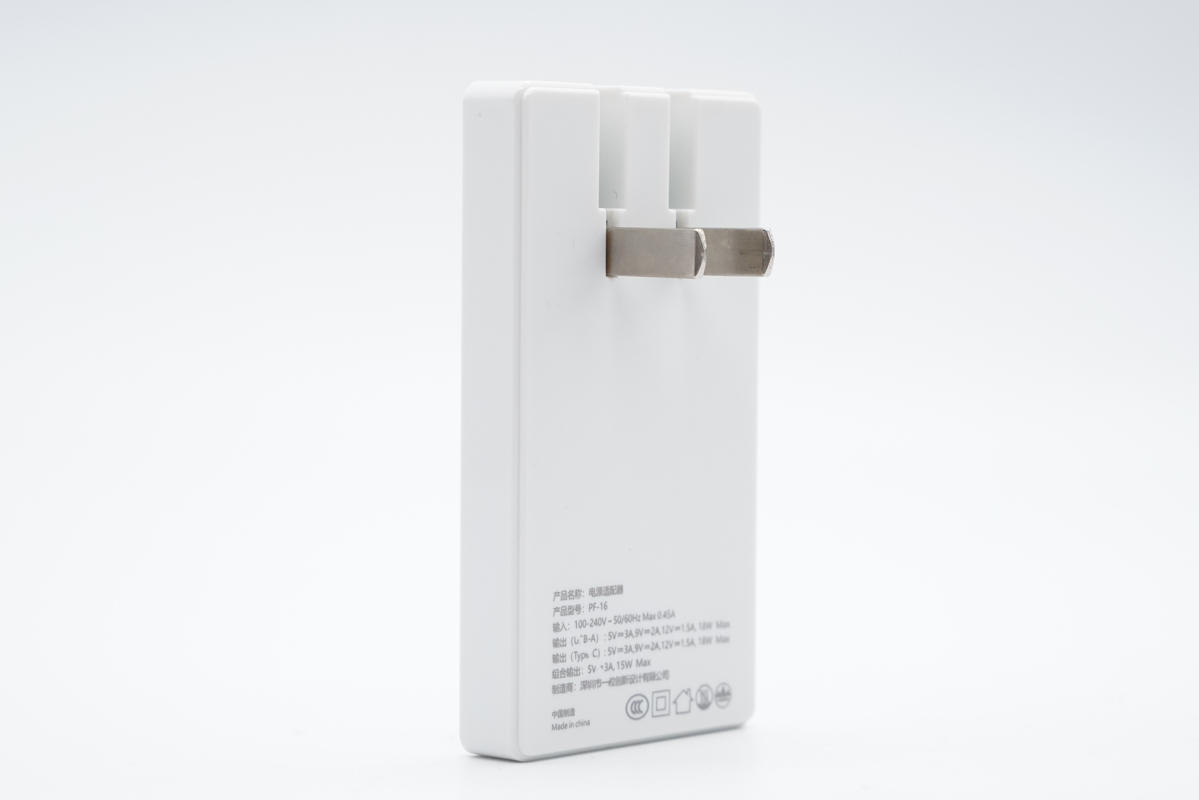 派凡18W 1A1C超薄PD旅行充电器机身洁白光滑,加之非常轻薄,整体颜值很高,初拿到手新鲜感十足。此外配备可折叠插脚,也让其变得非常便携。充电器配备1A1C接口,最大输出功率均为18W,双口输出最大功率15W,可满足两台设备同时充电需求。