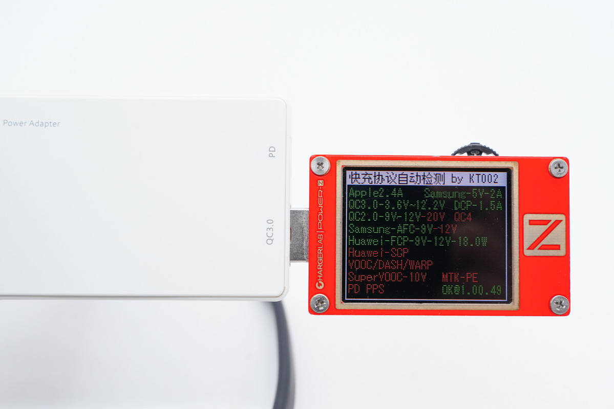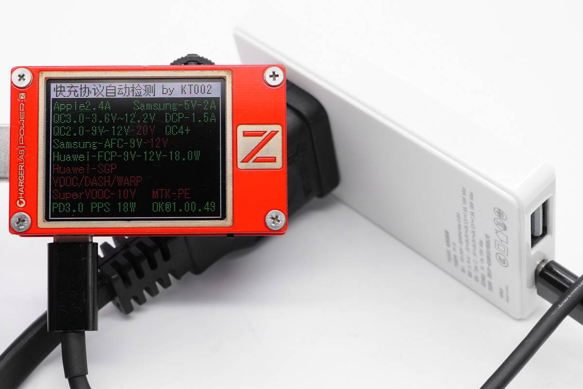 使用ChargerLAB POWER-Z KT002测得USB-A口支持Apple 2.4A、Samsung 5V2A、DCP协议,以及QC2.0/3.0、AFC、FCP快充协议。
