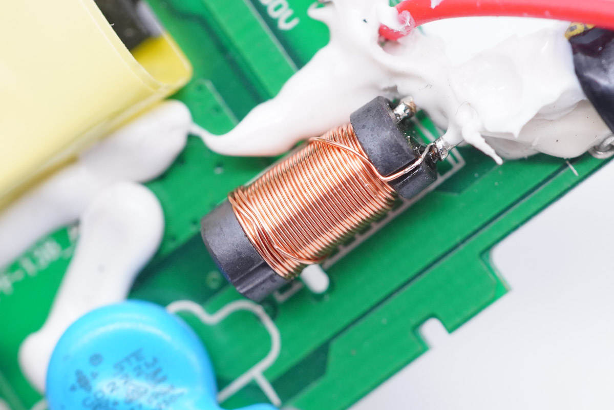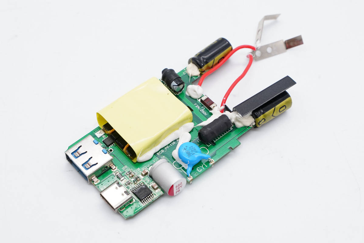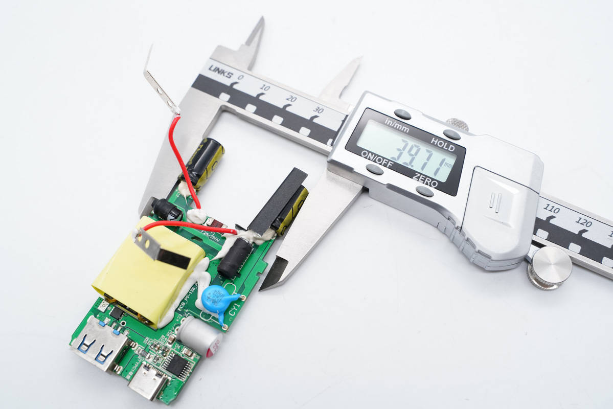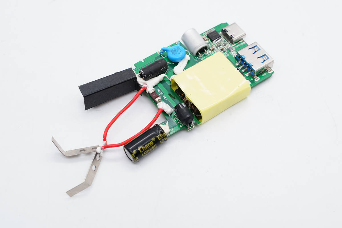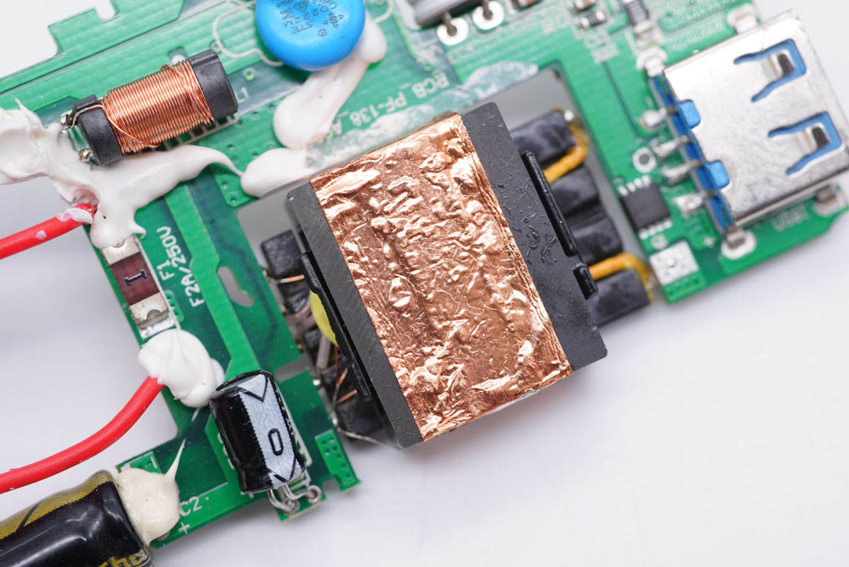 连接导线打胶加固绝缘,采用平面变压器,同时和电容、USB母座等一样沉板设计,以降低机身厚度。