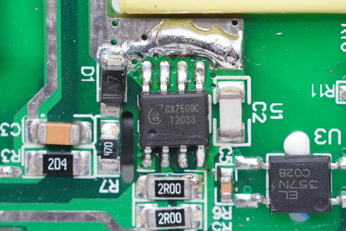 充电头网通过拆解了解到,机身壳采用卡扣进行封装,比较少见。充电器内部布局上,电容、工字电感等横置,同时和变压器、USB母座等器件一样做了沉板设计,采用的是超薄变压器进一步降低机身厚度。充电器采用了诚芯微CX7509C+CX7538B+CX2917AC全套快充方案,承包了开关电源到双口输出电压控制,此外输出VBUS开关管也是诚芯微的3419。整套方案集成度很高,可以看到主板外围电路很精简,让产品设计更加简单,同时对实现体积小型化节省系统成本也很有帮助。