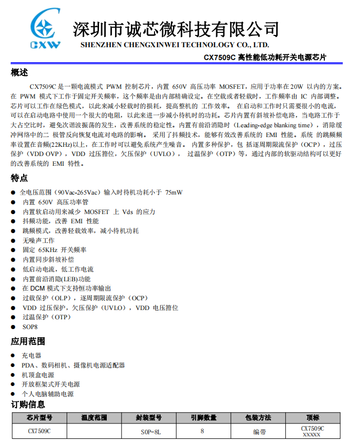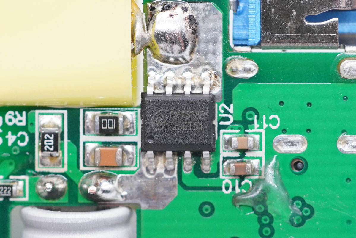 次级同步整流芯片同样来自诚芯微,型号CX7538B。这是一颗高性能的开关电源次级侧同步整流器芯片,在开关电源中轻松满足6级能效,是肖特基的理想替换方案。CX7538B支持最高150KHz开关频率,内置11mΩ低导阻NMOS管,发热远低于肖特基二极管,大幅度降低温度,提高转换效率。