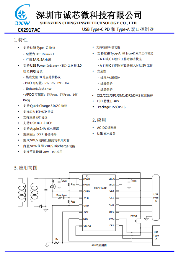 协议芯片也是采用诚芯微CX2917AC,这是一颗USB-C和USB-A双口控制器,兼容PD2.0/3.0、PPS、QC2.0/3.0、华为FCP/SCP、三星AFC、Apple 2.4A等协议,支持苹果最新20W PD应用。此外支持过压/欠压保护、 过流保护、过温保护,采用TSSOP-16封装。