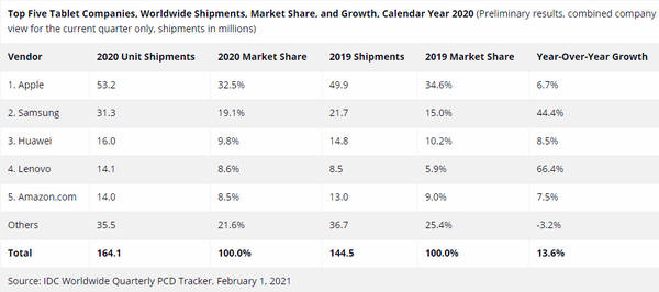 IDC数据显示,2020年全年,全球平板电脑出货量为1.641亿台,同比增长13.6%。