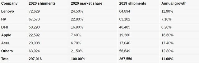 2021年,疫情袭来,在家办公、上课常态化,国外尤其如此。全球平板、笔记本电脑出货量在2020年恢复增长,