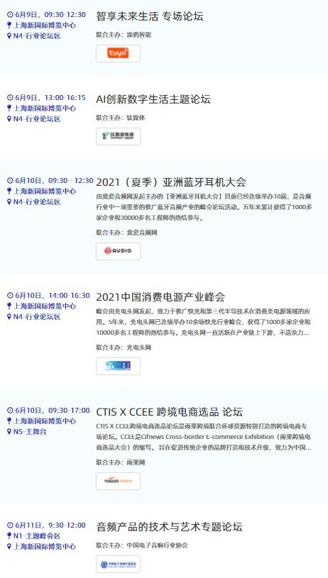 说过两大峰会,还有六大行业论坛,分别是涂鸦智能联合举办的智享未来生活专场论坛、钛媒体联合主办的AI创新数字生活主题论坛、雨果网联合主办的跨境电商选品论坛、中国电子音响行业协会联合主办的音频产品的技术与艺术专题论坛,以及我爱音频网联合主办的2021(夏季)亚洲蓝牙耳机大会和充电头网联合主办的2021中国消费电源产业峰会。