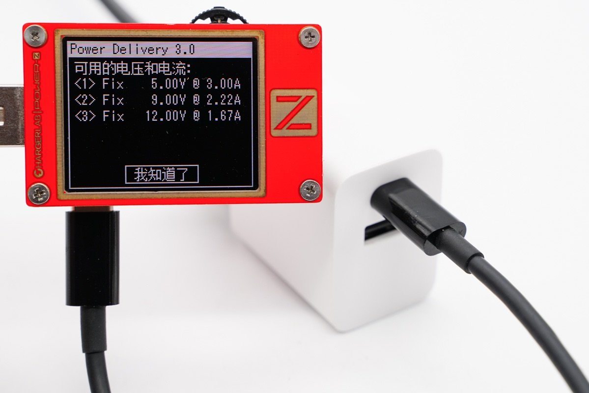 读取USB-C接口的PDO报文,实测支持5V3A、9V3A、12V3A、15V3A、20V3.25A五个固定PD输出电压档位。实测支持PD、Apple2.4A、QC2.0、QC3.0、AFC、FCP以及MTK-PE等快充协议。