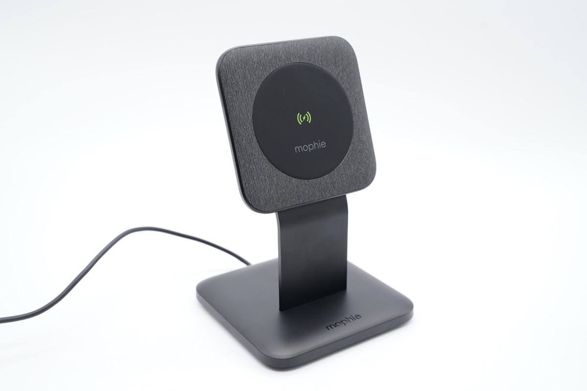 mophie 最新推出的这款立式磁吸无线充电器采用分离式的设计,底座与上面的无线充电器可以分开,方便外出携带。磁吸无线充电板正面,中间黑色位置为橡胶材质,吸附手机时防止划伤背板,四周灰色部分为日本东丽布艺覆盖,这一材质也在 mophie 的很多无线充电产品中见到过。