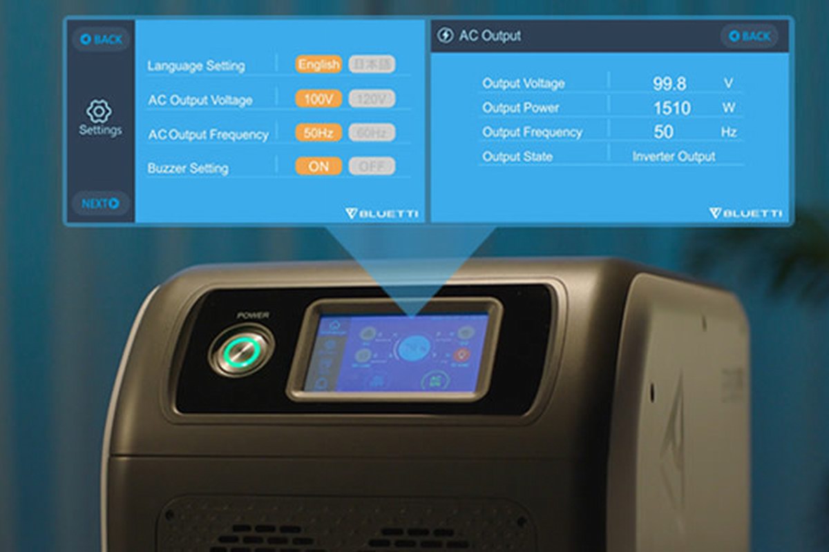 BLUETTI EP500系列通过智能触摸屏操控各种设定,并显示对应参数,可以设置菜单语言、输出电压、电压频率等参数,并显示当前电压、当前功率、当前频率等常用参数配置,并支持手机APP连接与OTA升级功能。