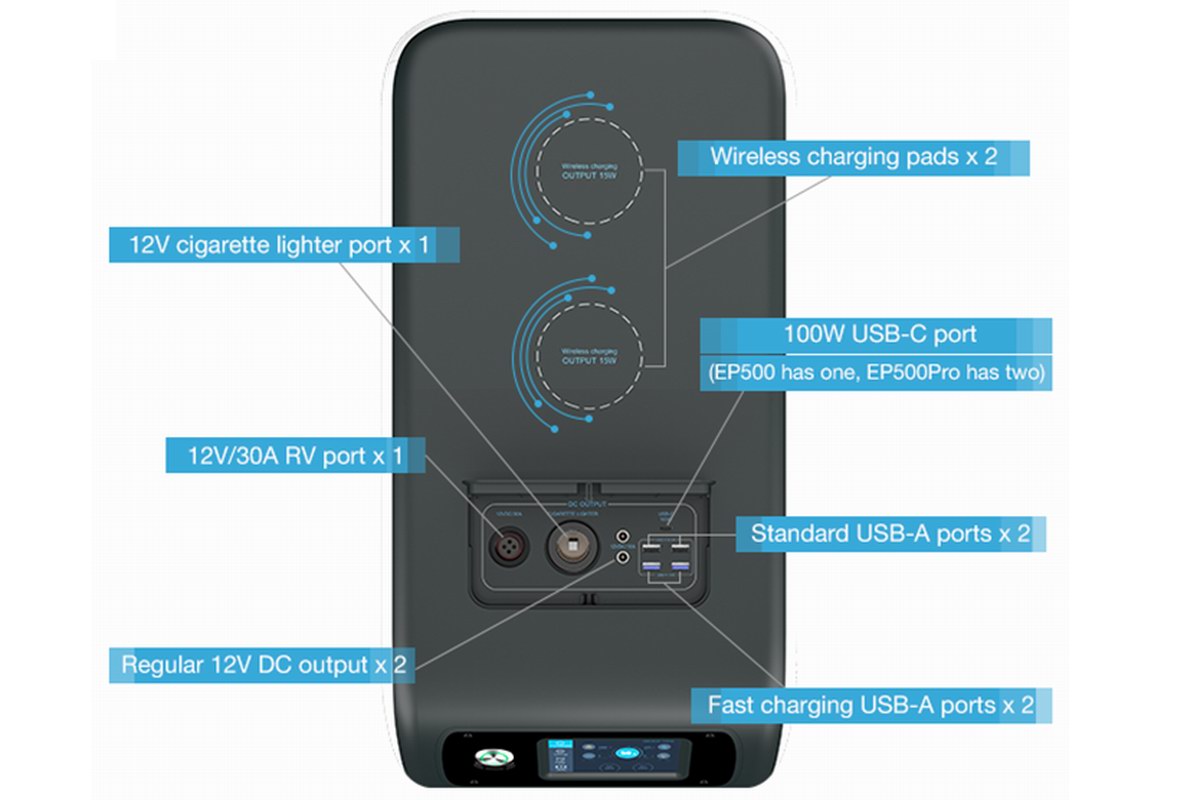 EP500系列拥有丰富的直流输出模块,顶部带有两个无线充电区域,一个12V30A RV接口、一个12V车充输出口、两个12V DC输出口、2个标准USB-A输出口、两个快充USB-A输出口、两个USB-C 100W PD快充输出口。多种输出手段让小型数码设备可以直接充电,高达100W PD快充也让笔记本、平板等产品可以满功率快充,简单易用。