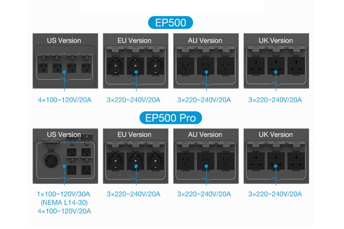 交流电输出配置方面,为适用于不同国家地区使用,EP500系列共有美规、欧规、澳规、英规四种地区插头配置可选。