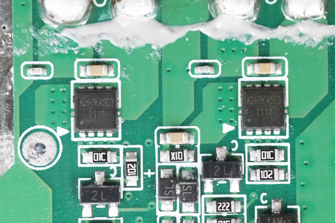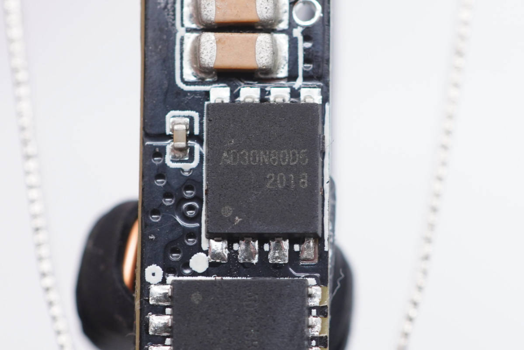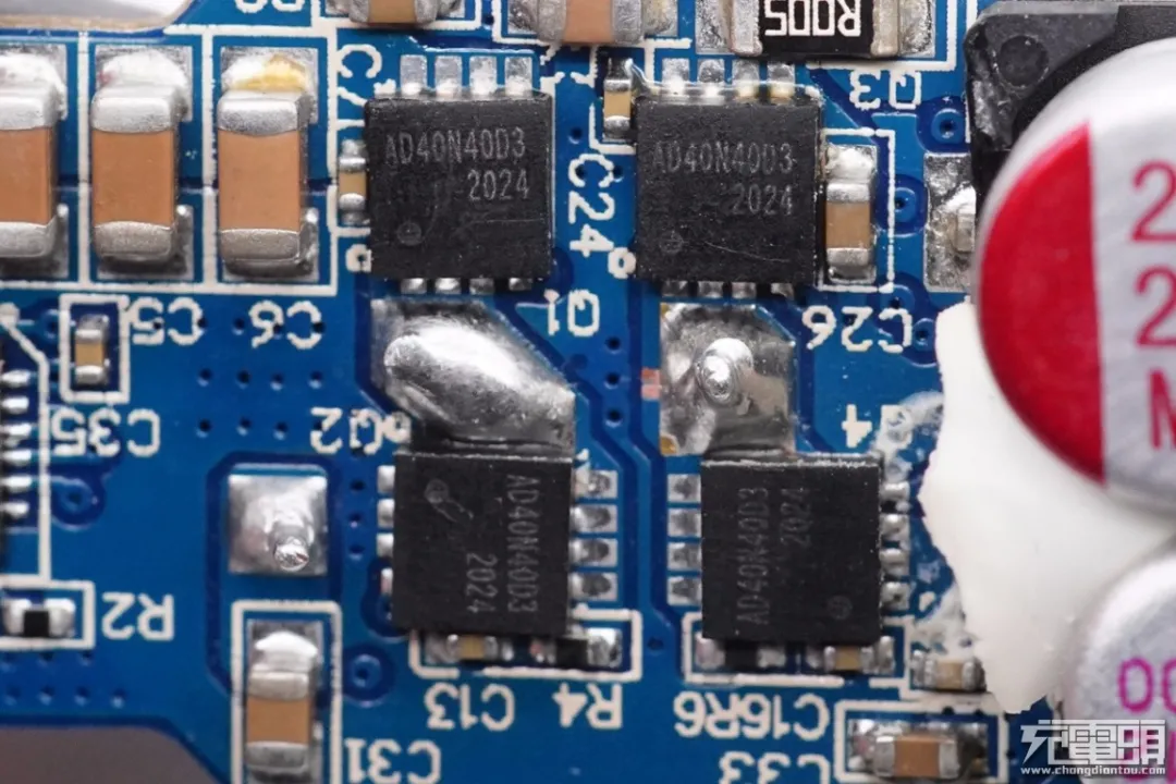 俊凯达 63W双口车充内部使用四颗砹德曼AD40N40D3进行同步升降压电压转换。