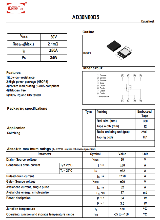 砹德曼AD30N80D5耐压30V,导阻2.1mΩ(Max),1.4moh(Typ@10v)采用HSOP8封装。