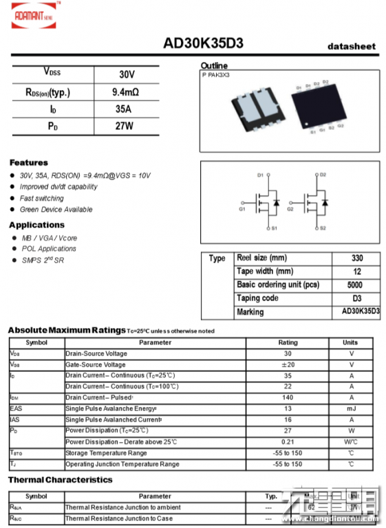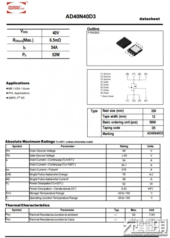 砹德曼AD40N40D3耐压40V,导阻6.5mΩ,采用PPAK3*3封装。(对应产品规格升级:AD40N50D3, AD40N60D5)