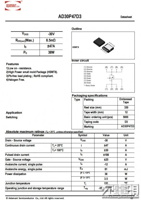 砹德曼AD30P47D3为PMOS,导阻为8.5mΩ,耐压-30V,采用HSMT8封装。(还有性价比更高的AD30P30D3)