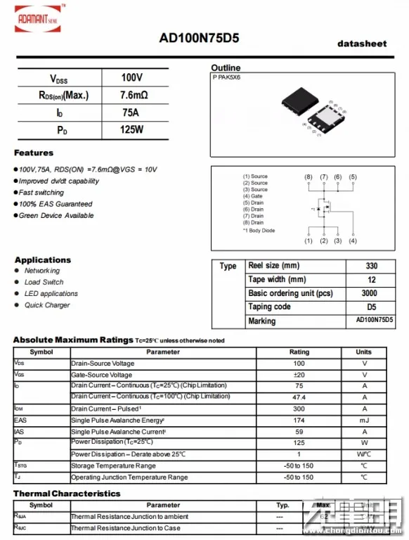 砹德曼AD100N75D5耐压100V,导阻7.6mΩ,采用PPAK5*6封装。(同系列产品:AD100N60D5, AD100N70D5, AD100N70T2, AD100N80T2,AD100N145T2)