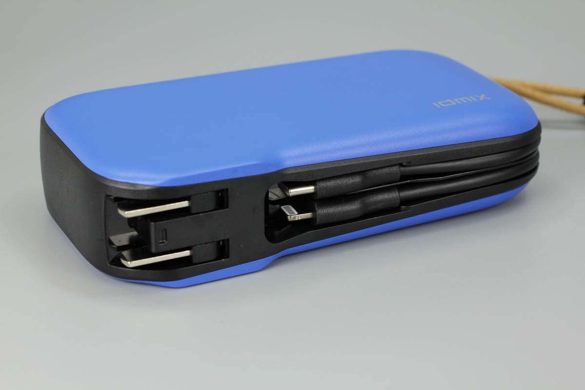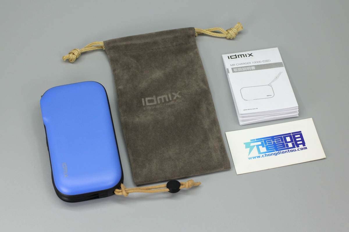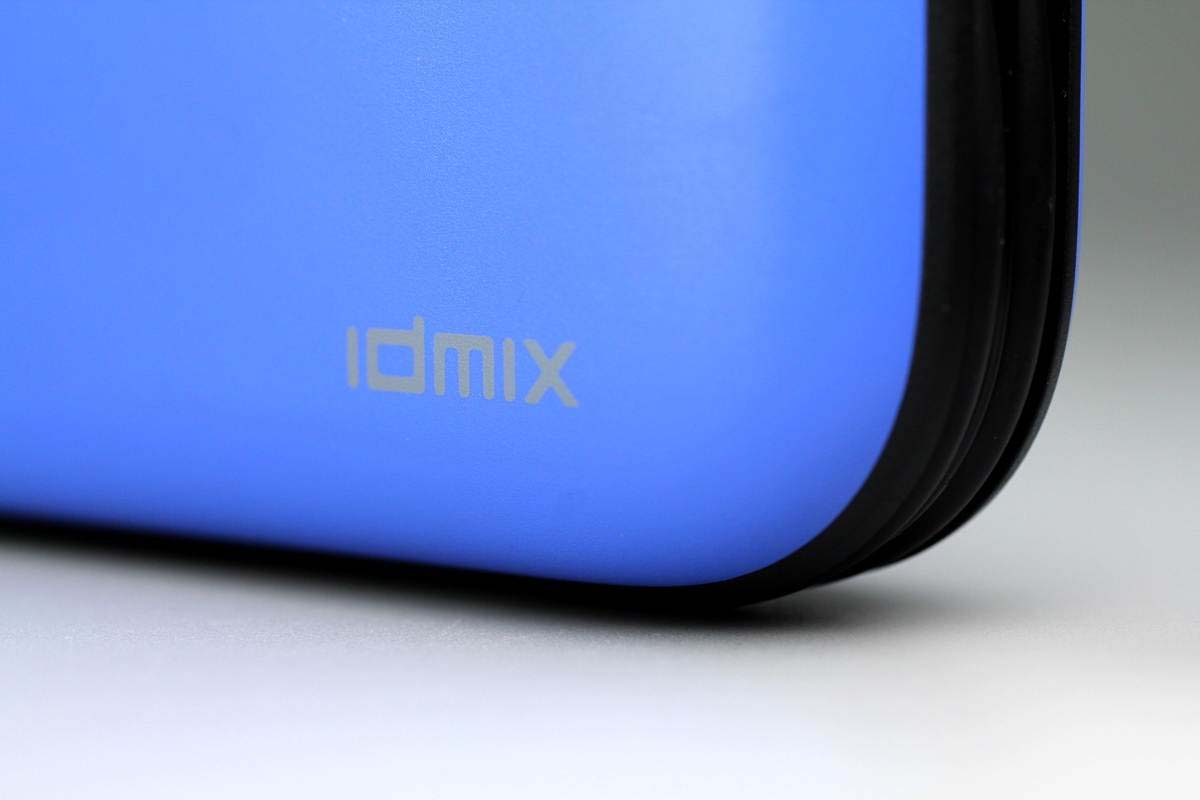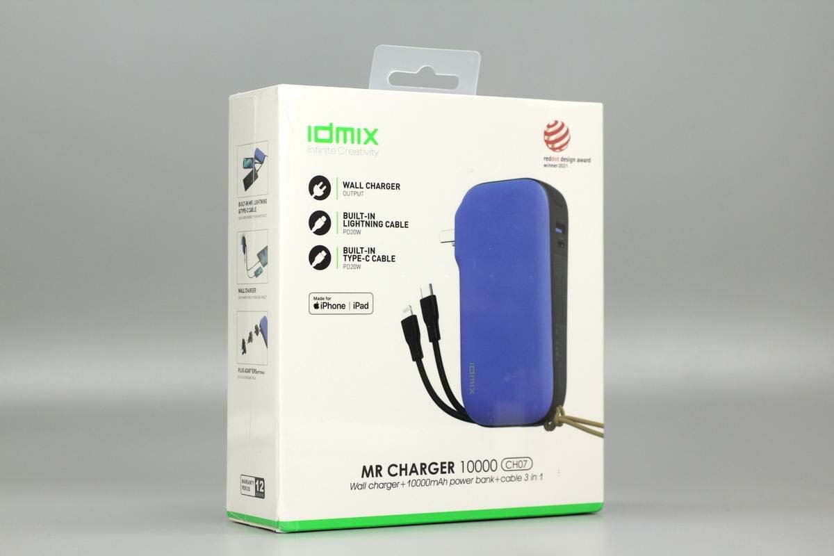 包装盒顶部带有塑料挂钩,正面印有IDMIX品牌、移动电源外观和名称、MFI认证标识等。