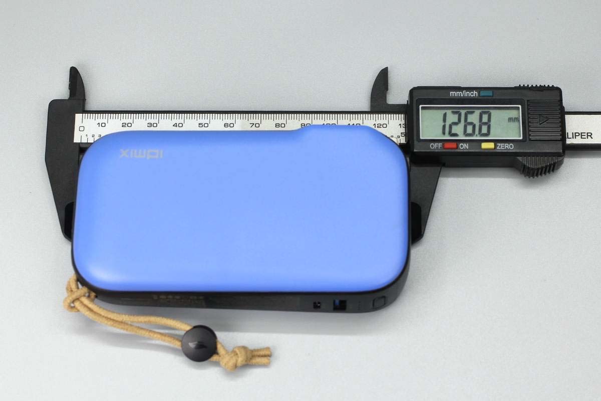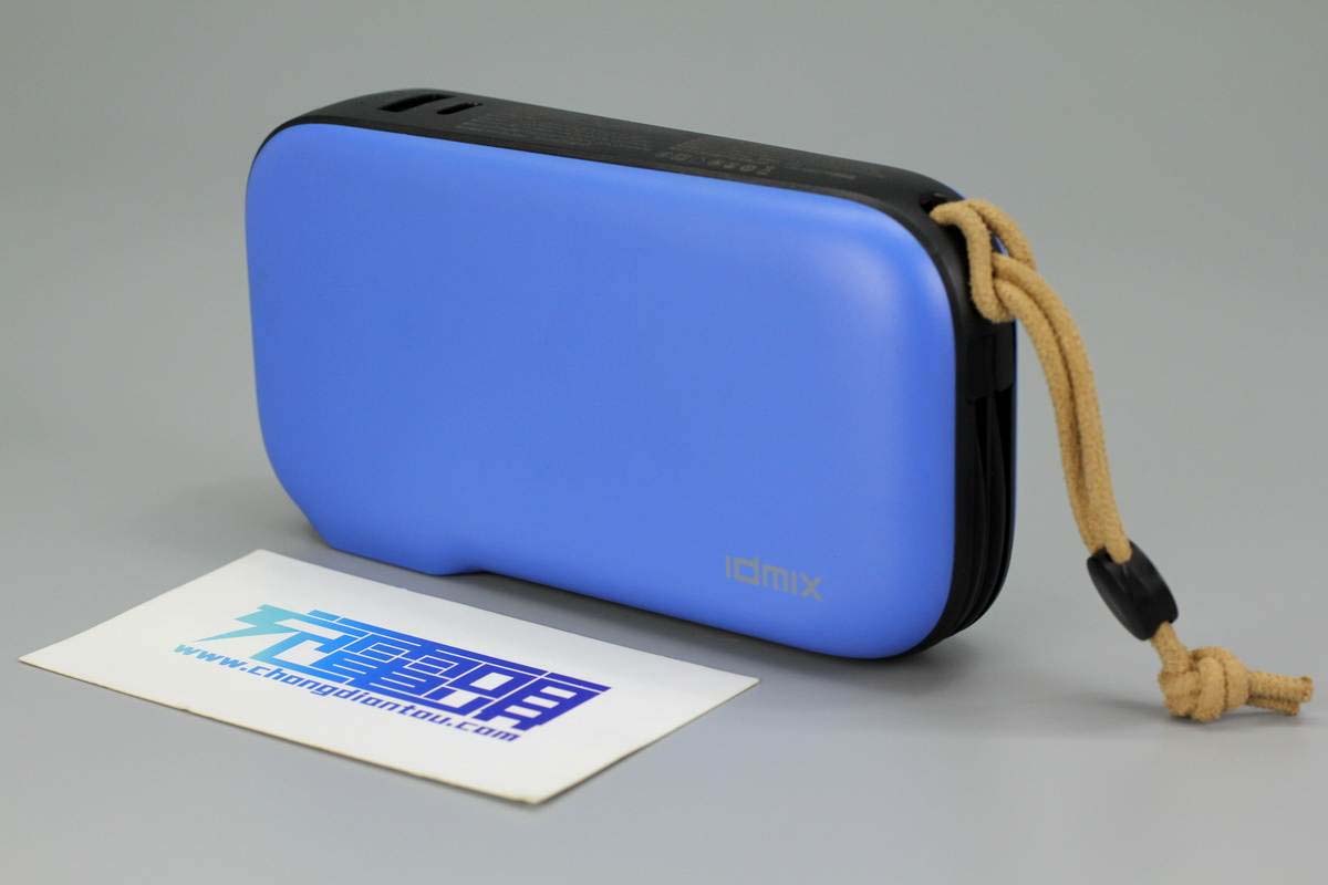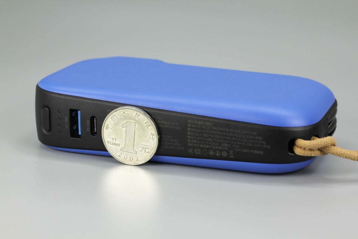 移动电源蓝黑配色,机身壳表面磨砂,边缘圆润握持手感好。其中一端设计有提绳,方便携带。