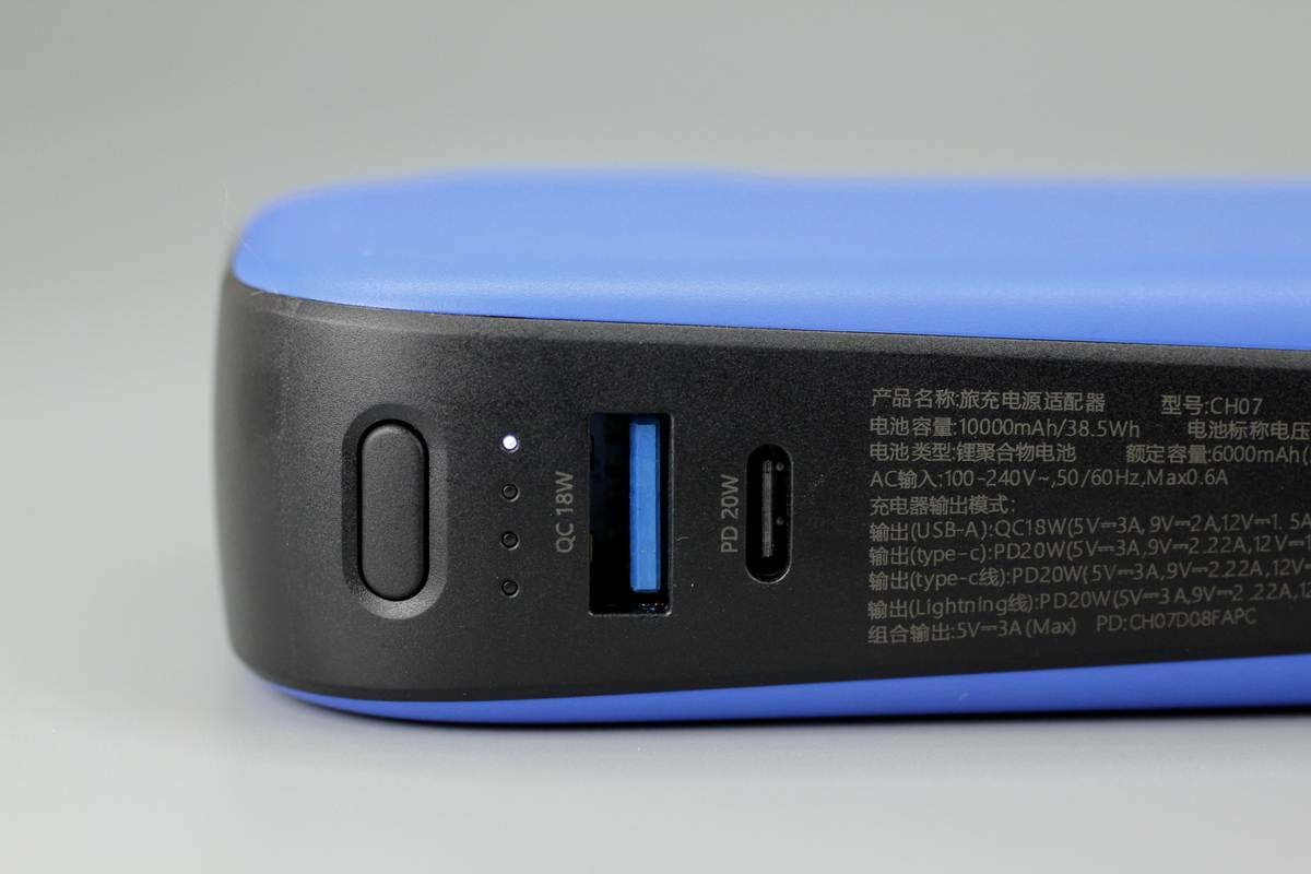 侧面一端设有电源键、LED电量指示灯以及1A1C接口,接口旁印有对应输出功率标识。